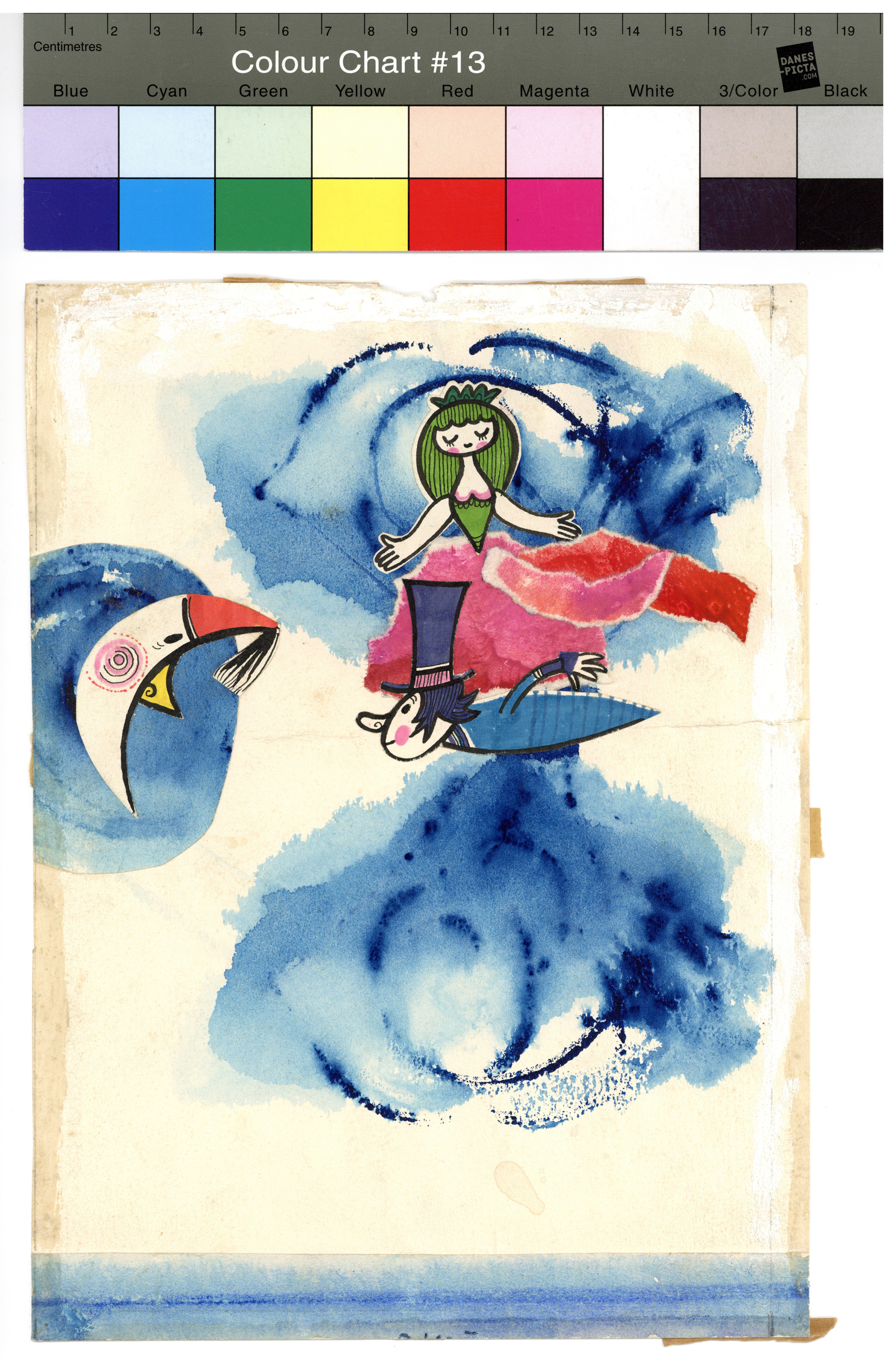 Popis: Kolorovaná kresba, koláž, tempera, papír. Ilustrace pro knihu Václava Čtvrtka Pohádky ze čtyř studánek.