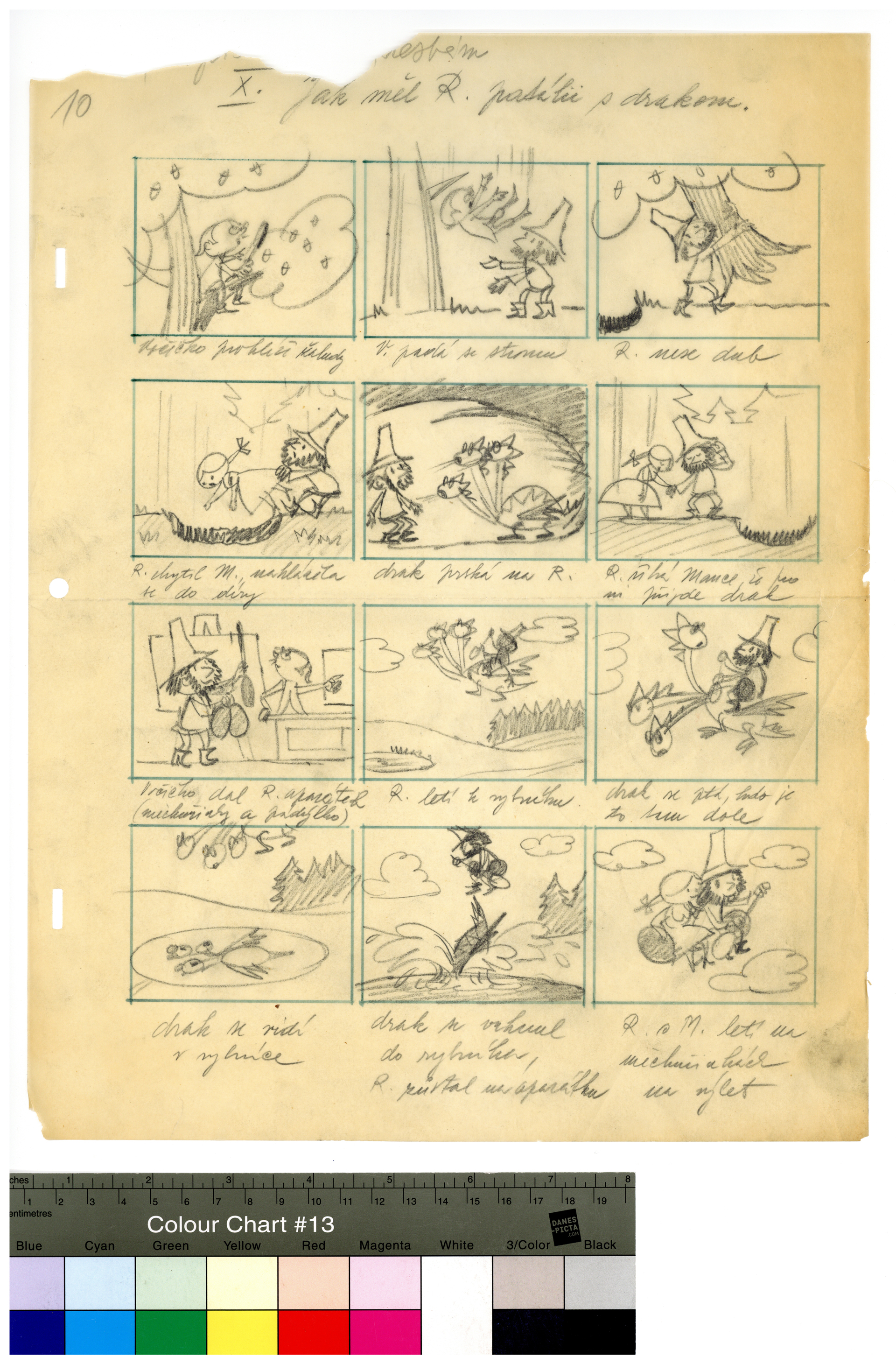Popis: Kresba tužkou na pauzovacím papíře. Skica devátého pokračování obrázkového seriálu Rumcajs pro časopis Svět sovětů. Týdeník, jehož posláním byla propagace „věčného přátelství“ se Sovětským svazem, musel v roce 1968 reagovat nejen na změny politické situace a společenské atmosféry, ale také na pokusy o hospodářské reformy. Redakce pod novou značku S 32 (odkazující k rozsahu časopisu), nabídla čtenářům adaptaci populárního televizního večerníčku o loupežníku Rumcajsovi. Scénář komentovaného seriálu připravil režisér původní animované verze Ladislav Čapek. Byl to pravděpodobně on, kdo rozvrhl každou ze třinácti epizod do pravidelné mřížky panelů na pauzovacím papíře, využívaném animátory při rozkreslování fází pohybu. Radek Pilař pak nakreslil tuší jednotlivé obrázky, které se tiskly s modrou nebo žlutou doplňkovou barvou.
