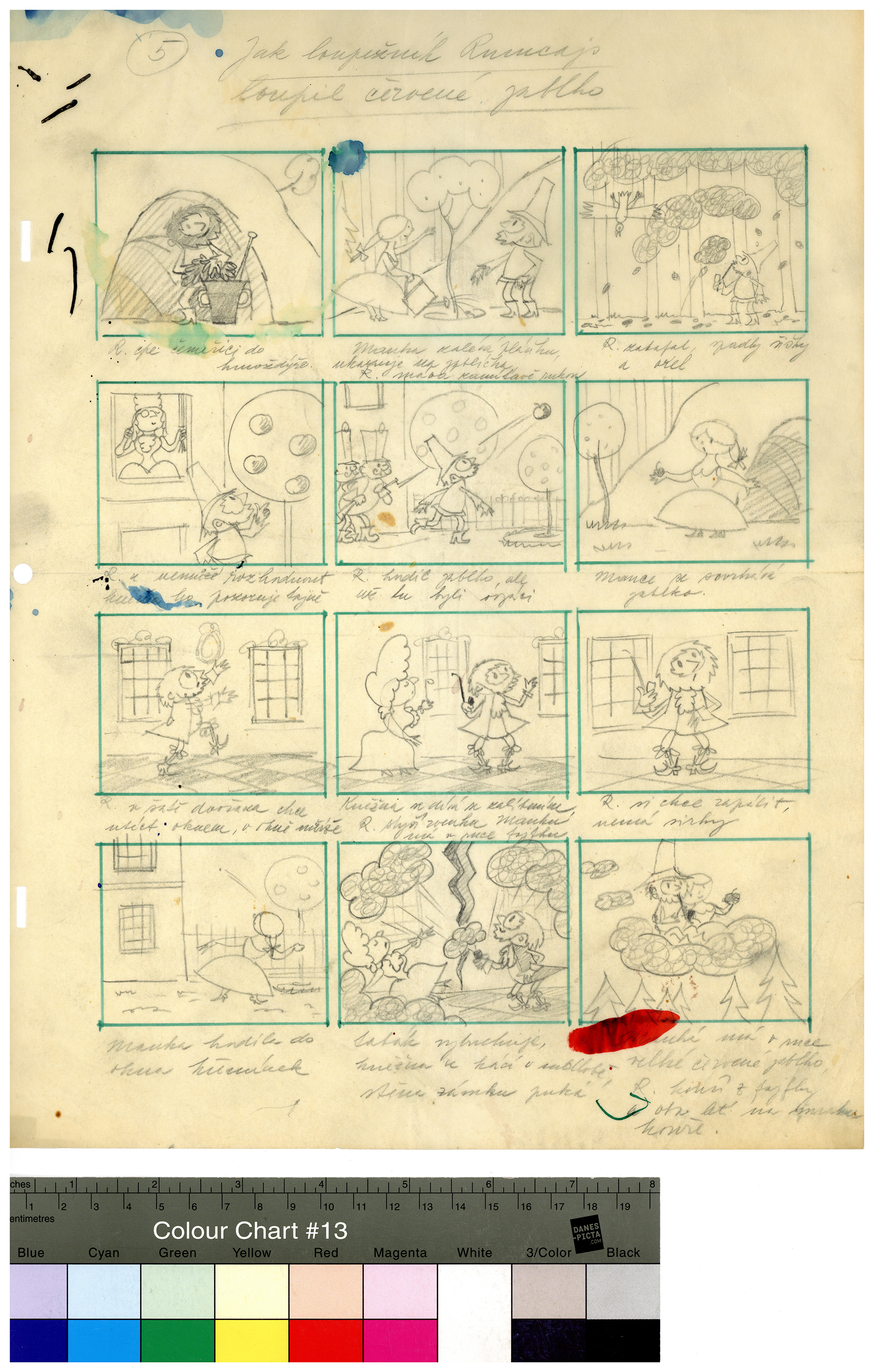 Popis: Kresba tužkou na pauzovacím papíře. Skica pátého pokračování obrázkového seriálu Rumcajs pro časopis Svět sovětů. Týdeník, jehož posláním byla propagace „věčného přátelství“ se Sovětským svazem, musel v roce 1968 reagovat nejen na změny politické situace a společenské atmosféry, ale také na pokusy o hospodářské reformy. Redakce pod novou značku S 32 (odkazující k rozsahu časopisu), nabídla čtenářům adaptaci populárního televizního večerníčku o loupežníku Rumcajsovi. Scénář komentovaného seriálu připravil režisér původní animované verze Ladislav Čapek. Byl to pravděpodobně on, kdo rozvrhl každou ze třinácti epizod do pravidelné mřížky panelů na pauzovacím papíře, využívaném animátory při rozkreslování fází pohybu. Radek Pilař pak nakreslil tuší jednotlivé obrázky, které se tiskly s modrou nebo žlutou doplňkovou barvou.