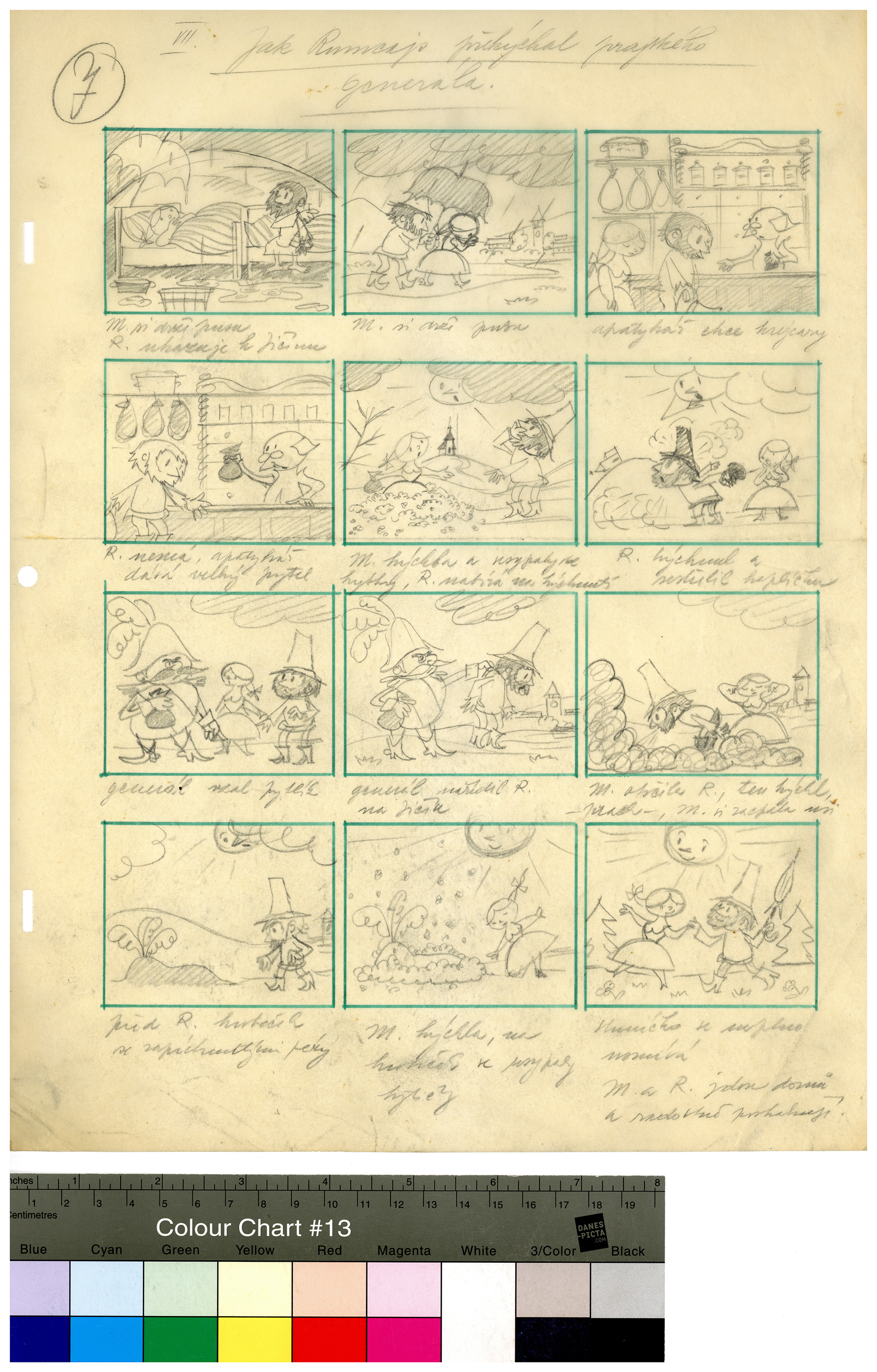 Popis: Kresba tužkou na pauzovacím papíře. Skica sedmého pokračování obrázkového seriálu Rumcajs pro časopis Svět sovětů. Týdeník, jehož posláním byla propagace „věčného přátelství“ se Sovětským svazem, musel v roce 1968 reagovat nejen na změny politické situace a společenské atmosféry, ale také na pokusy o hospodářské reformy. Redakce pod novou značku S 32 (odkazující k rozsahu časopisu), nabídla čtenářům adaptaci populárního televizního večerníčku o loupežníku Rumcajsovi. Scénář komentovaného seriálu připravil režisér původní animované verze Ladislav Čapek. Byl to pravděpodobně on, kdo rozvrhl každou ze třinácti epizod do pravidelné mřížky panelů na pauzovacím papíře, využívaném animátory při rozkreslování fází pohybu. Radek Pilař pak nakreslil tuší jednotlivé obrázky, které se tiskly s modrou nebo žlutou doplňkovou barvou.