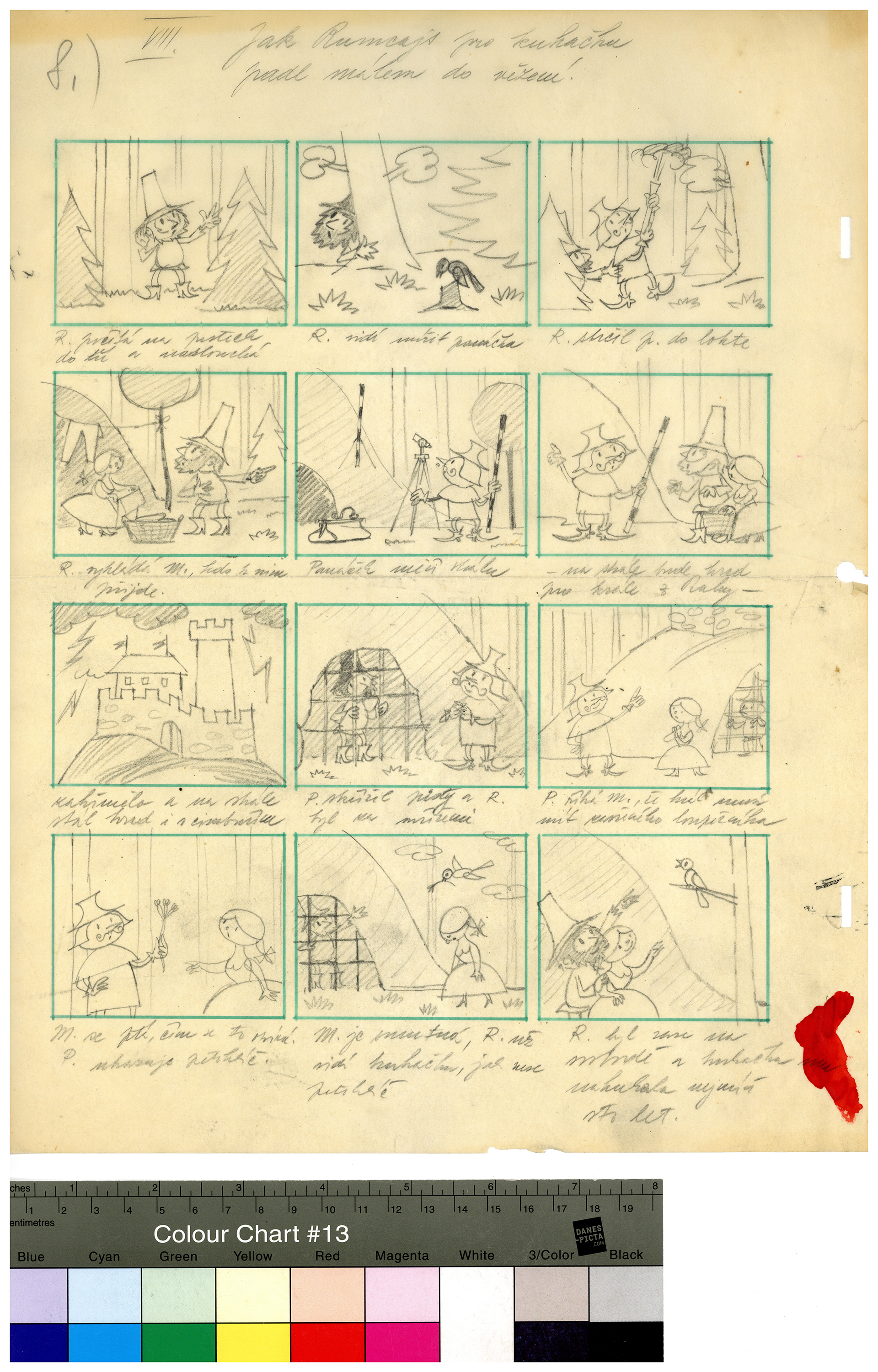 Popis: Kresba tužkou na pauzovacím papíře. Skica osmého pokračování obrázkového seriálu Rumcajs pro časopis Svět sovětů. Týdeník, jehož posláním byla propagace „věčného přátelství“ se Sovětským svazem, musel v roce 1968 reagovat nejen na změny politické situace a společenské atmosféry, ale také na pokusy o hospodářské reformy. Redakce pod novou značku S 32 (odkazující k rozsahu časopisu), nabídla čtenářům adaptaci populárního televizního večerníčku o loupežníku Rumcajsovi. Scénář komentovaného seriálu připravil režisér původní animované verze Ladislav Čapek. Byl to pravděpodobně on, kdo rozvrhl každou ze třinácti epizod do pravidelné mřížky panelů na pauzovacím papíře, využívaném animátory při rozkreslování fází pohybu. Radek Pilař pak nakreslil tuší jednotlivé obrázky, které se tiskly s modrou nebo žlutou doplňkovou barvou.