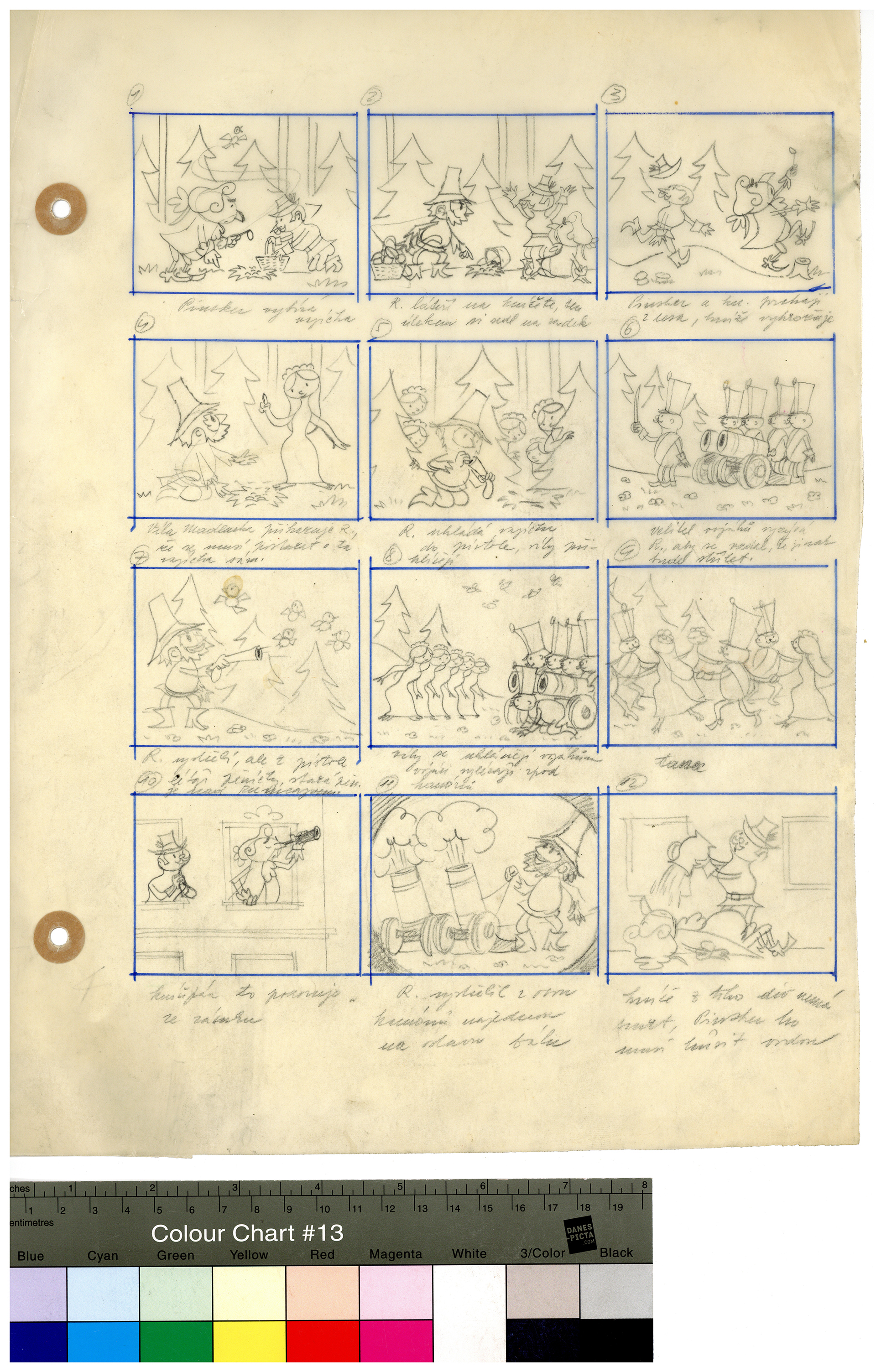 Popis: Kresba tužkou na pauzovacím papíře. Skica třetího pokračování obrázkového seriálu Rumcajs pro časopis Svět sovětů. Týdeník, jehož posláním byla propagace „věčného přátelství“ se Sovětským svazem, musel v roce 1968 reagovat nejen na změny politické situace a společenské atmosféry, ale také na pokusy o hospodářské reformy. Redakce pod novou značku S 32 (odkazující k rozsahu časopisu), nabídla čtenářům adaptaci populárního televizního večerníčku o loupežníku Rumcajsovi. Scénář komentovaného seriálu připravil režisér původní animované verze Ladislav Čapek. Byl to pravděpodobně on, kdo rozvrhl každou ze třinácti epizod do pravidelné mřížky panelů na pauzovacím papíře, využívaném animátory při rozkreslování fází pohybu. Radek Pilař pak nakreslil tuší jednotlivé obrázky, které se tiskly s modrou nebo žlutou doplňkovou barvou.