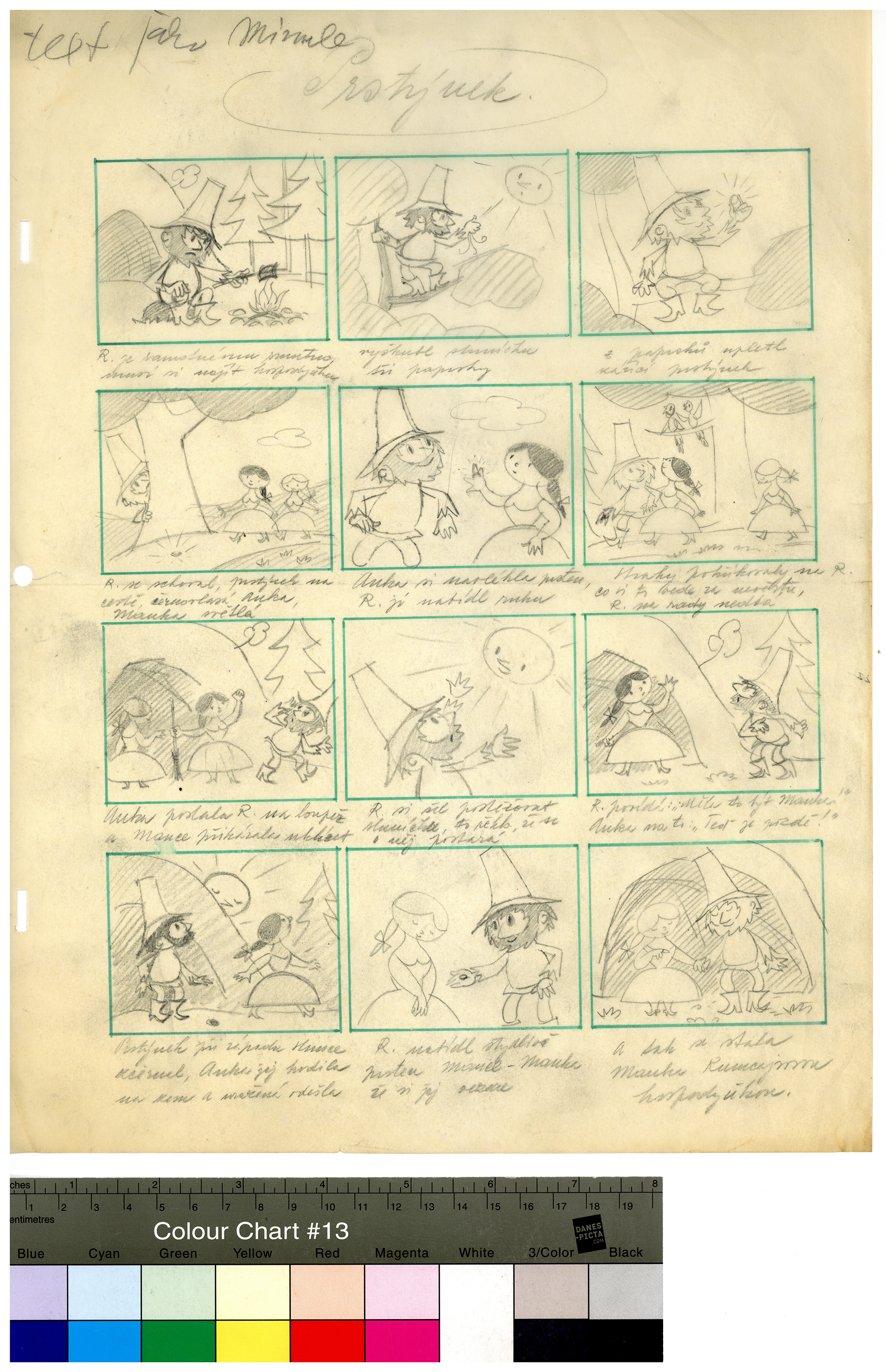 Popis: Kresba tužkou na pauzovacím papíře. Skica čtvrtého pokračování obrázkového seriálu Rumcajs pro časopis Svět sovětů. Týdeník, jehož posláním byla propagace „věčného přátelství“ se Sovětským svazem, musel v roce 1968 reagovat nejen na změny politické situace a společenské atmosféry, ale také na pokusy o hospodářské reformy. Redakce pod novou značku S 32 (odkazující k rozsahu časopisu), nabídla čtenářům adaptaci populárního televizního večerníčku o loupežníku Rumcajsovi. Scénář komentovaného seriálu připravil režisér původní animované verze Ladislav Čapek. Byl to pravděpodobně on, kdo rozvrhl každou ze třinácti epizod do pravidelné mřížky panelů na pauzovacím papíře, využívaném animátory při rozkreslování fází pohybu. Radek Pilař pak nakreslil tuší jednotlivé obrázky, které se tiskly s modrou nebo žlutou doplňkovou barvou.