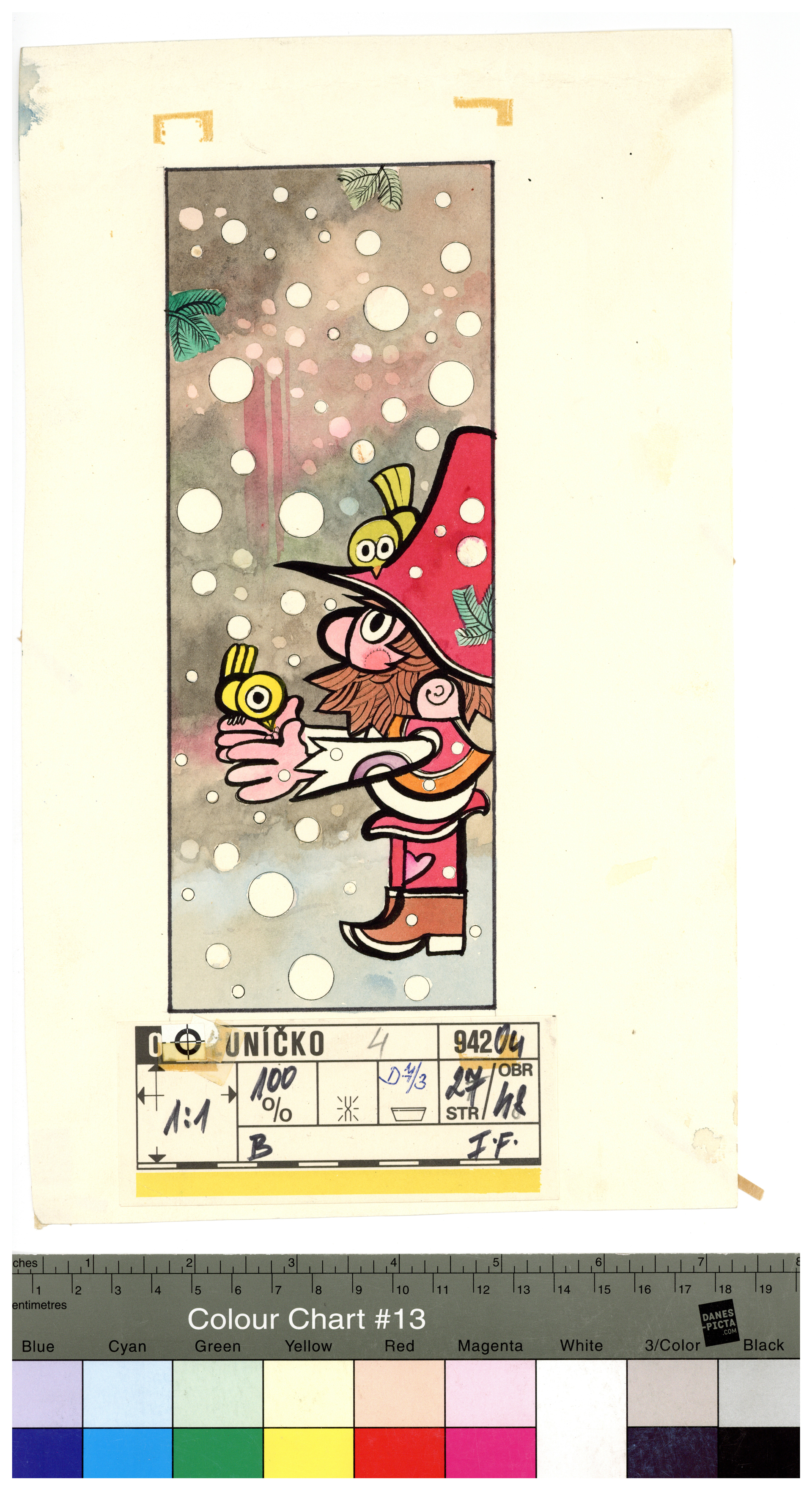Popis: Kolorovaná kresba na papíře, 178 × 293 mm. Ilustrace k vyprávění Václava Čtvrtka Jak Rumcajs nadělil jičínskému knížepánovi.