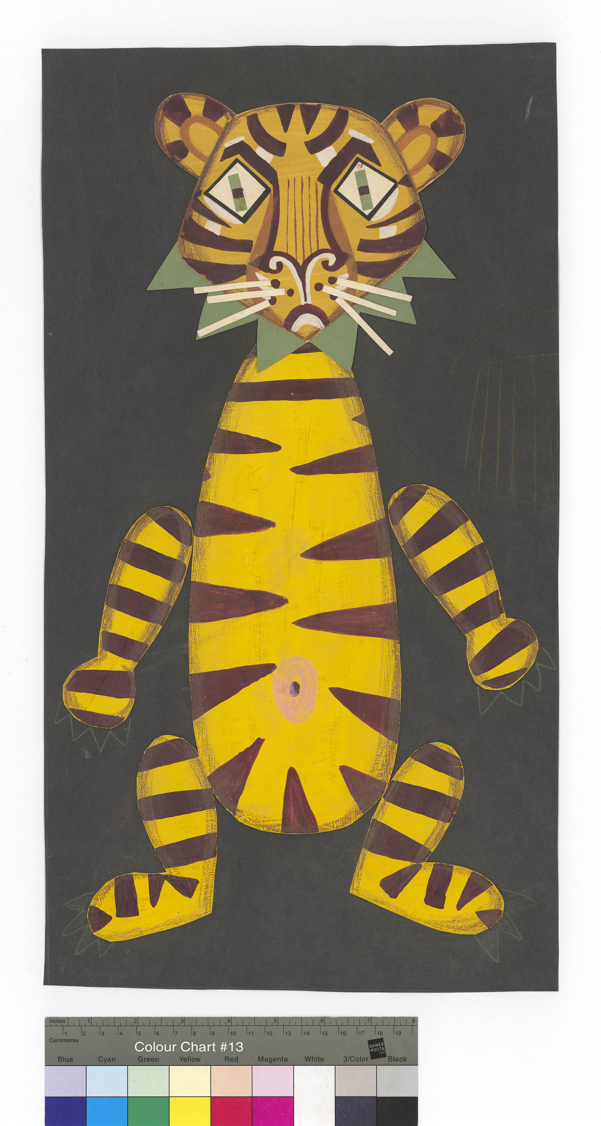 Popis: Tempera, koláž, papír, 280 × 515 mm. Návrh loutky pro televizní inscenaci pohádky Hanny Januszewské o tygrovi, který se vypravil do světa hledat odvahu.