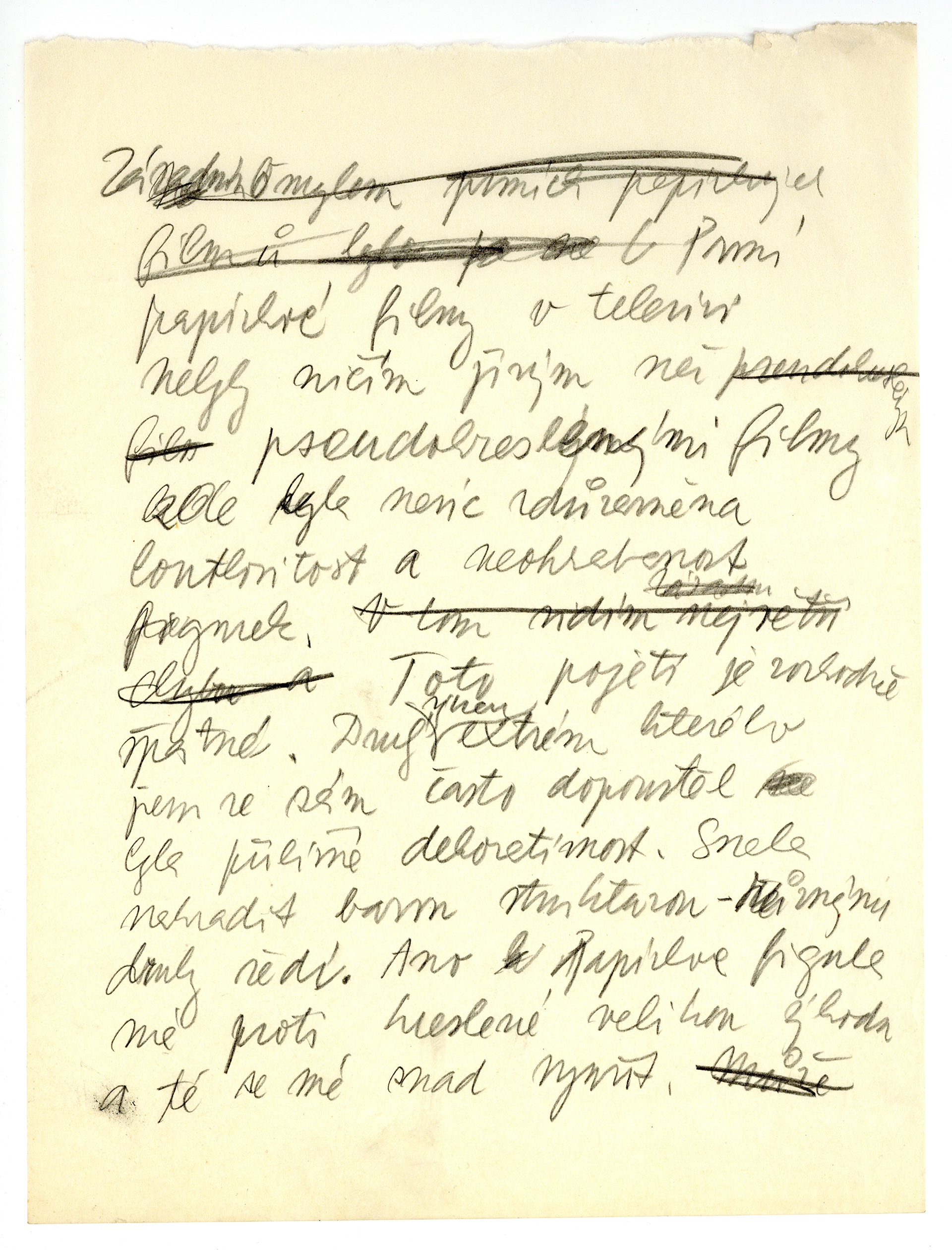 Popis: Rukopis, 9 stran. Text reaguje na stať Ladislava Smoljaka Televize a umění (ze sborníku Čtyřikrát o televizi, Československý spisovatel, 1961, s. 99–134). Pilař se zamýšlí nad aktuální situací v tvorbě animovaných filmů pro televizní obrazovky, vyžaduje účast výtvarníka na přípravě scénáře a proti pevné obrysové kresbě prosazuje papírkovou (ploškovou) loutku.