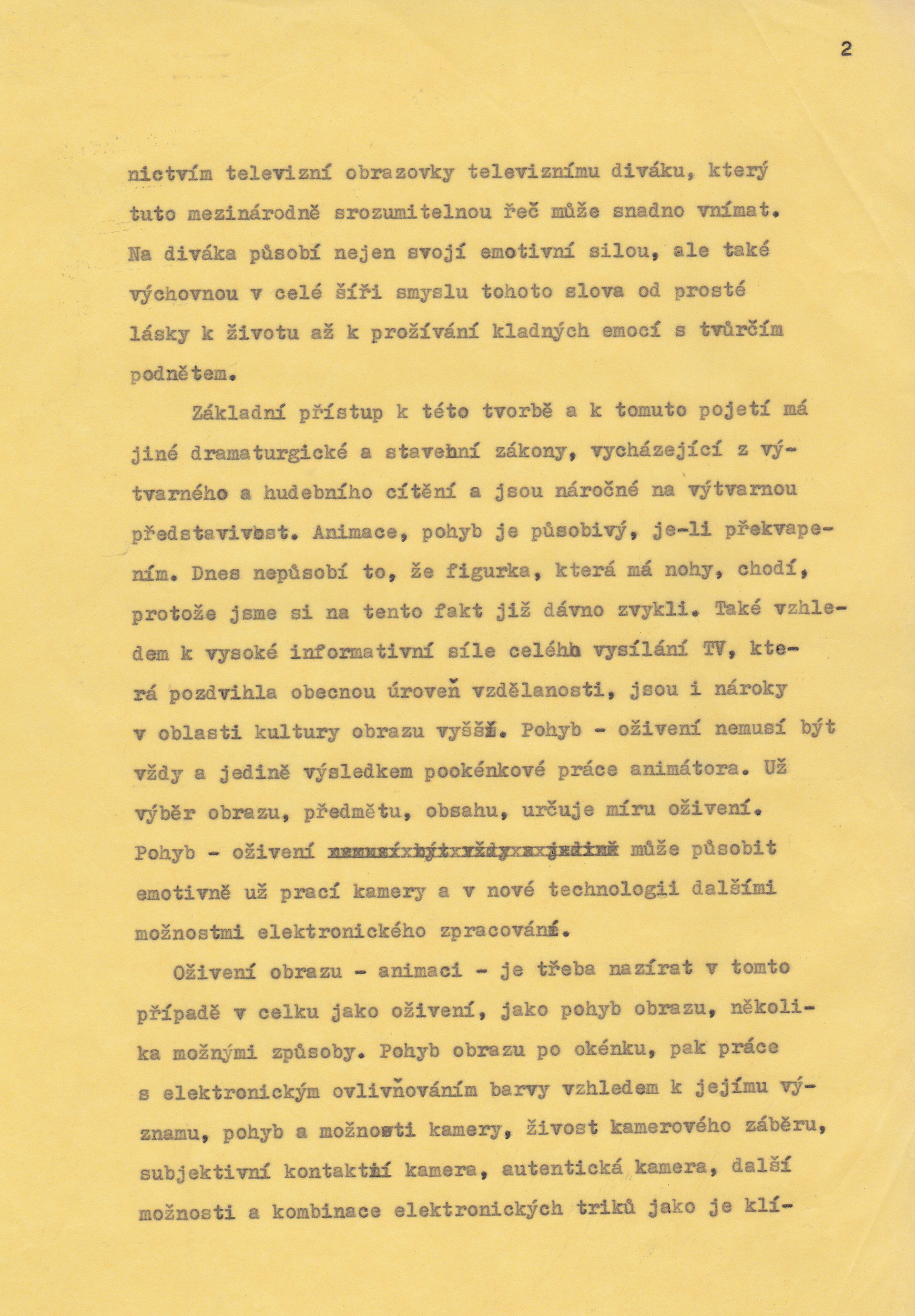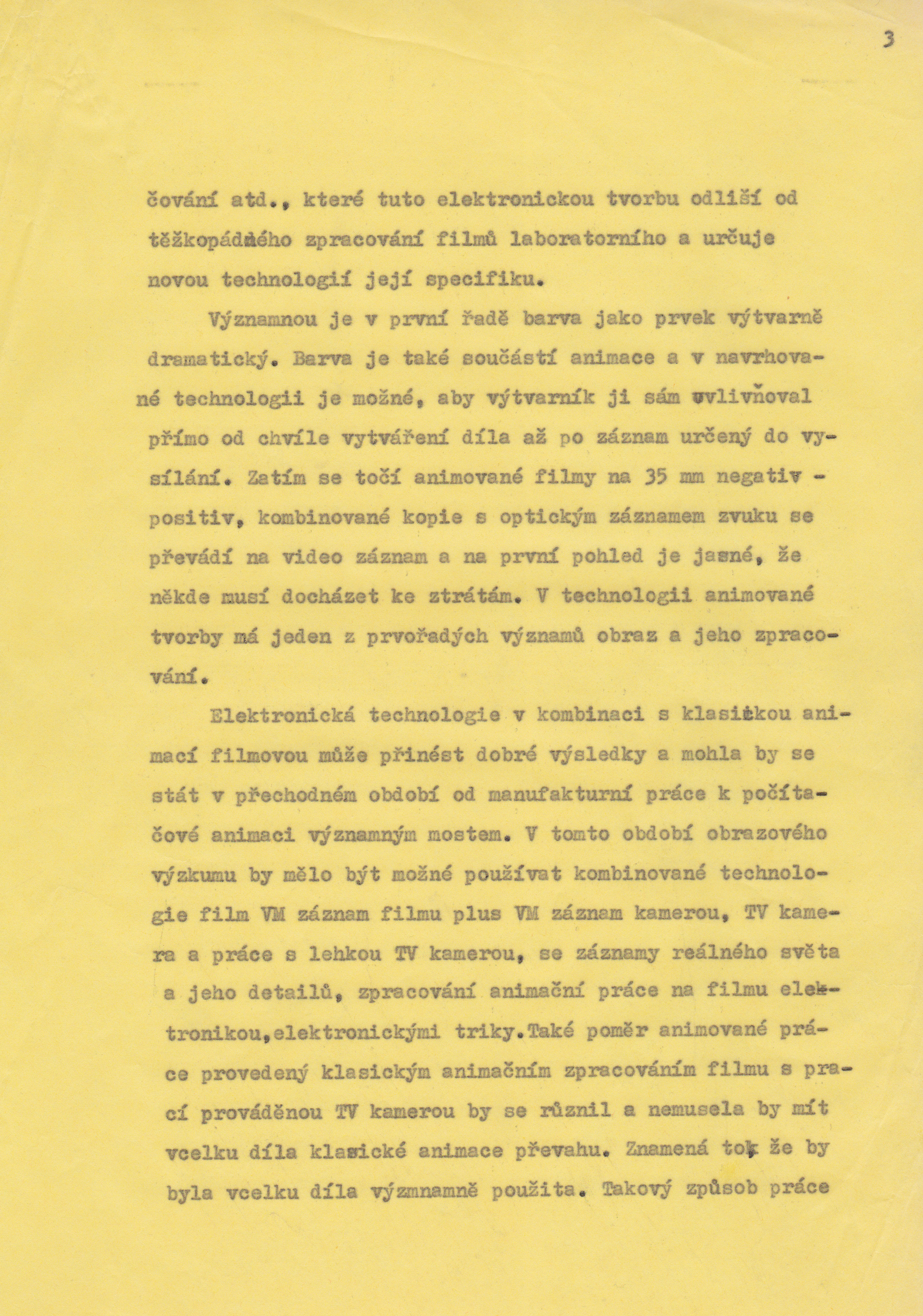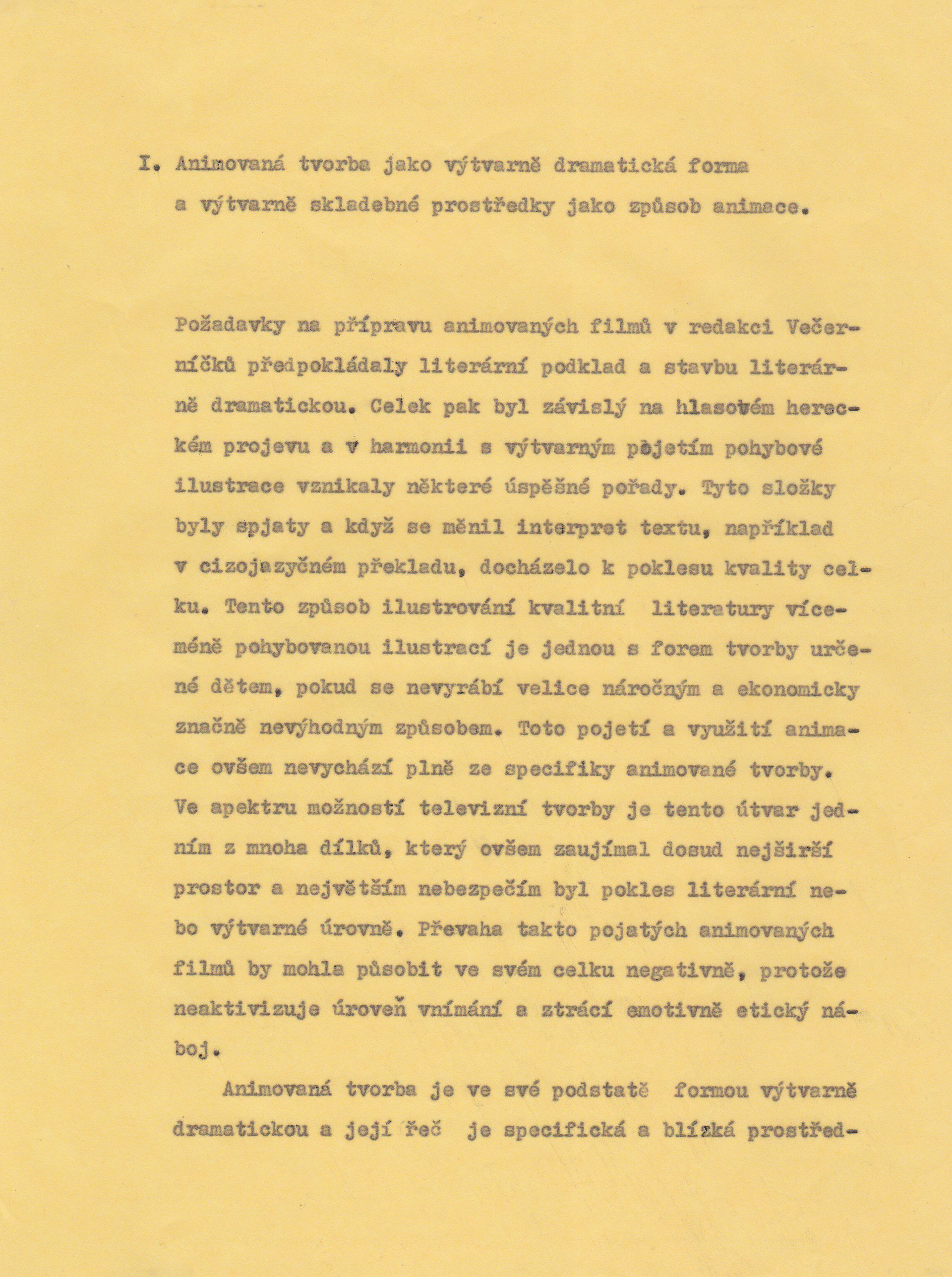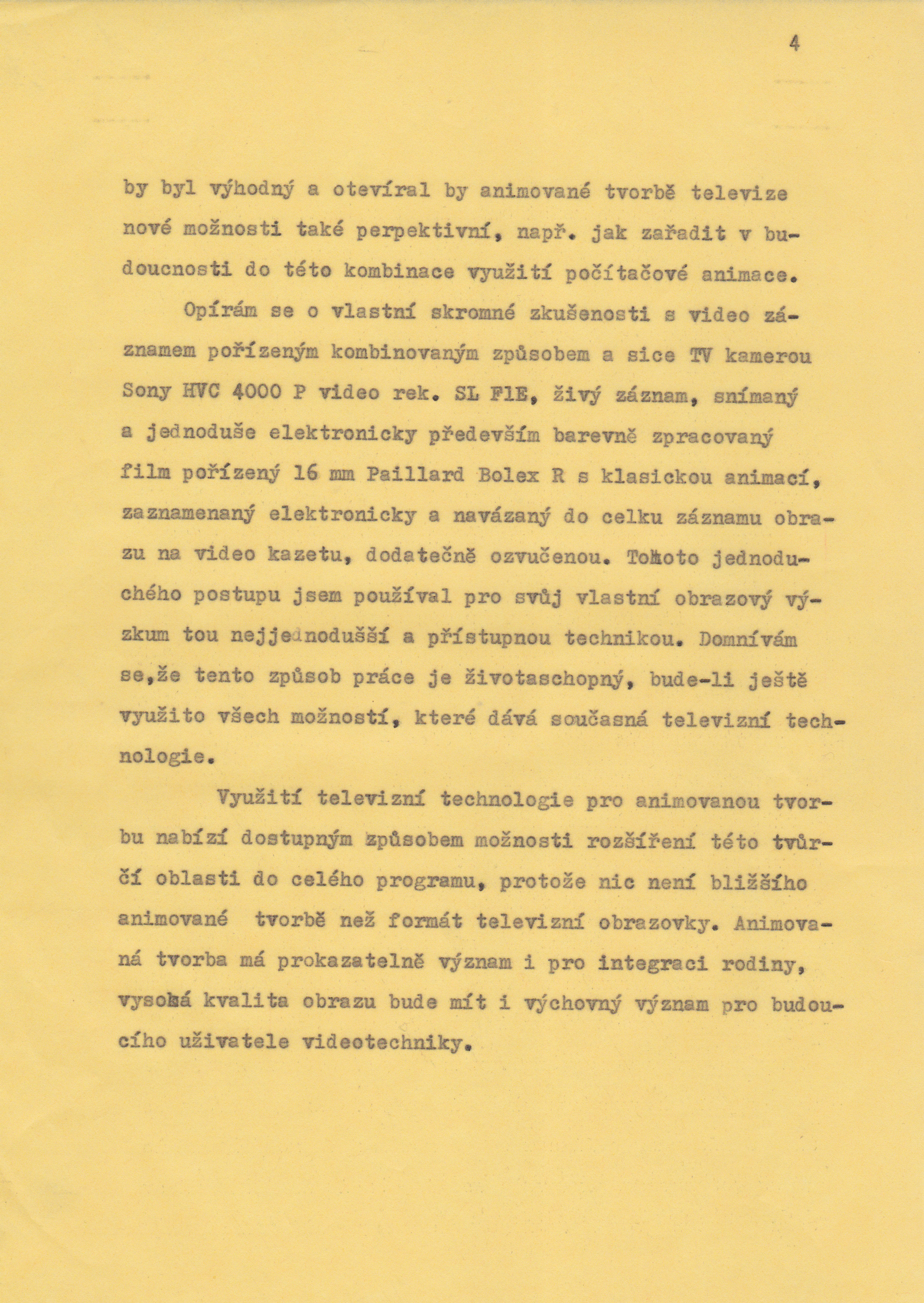 Popis: Strojopis, 4 strany. Dokument s názvem „I. Animovaná tvorba jako výtvarně dramatická forma a výtvarně skladebné prostředky jako způsob animace“ je první částí návrhu na zřízení experimentálního televizního studia obrazového výzkumu. Navazuje na předchozí neúspěšný návrh, podaný v roce 1984.