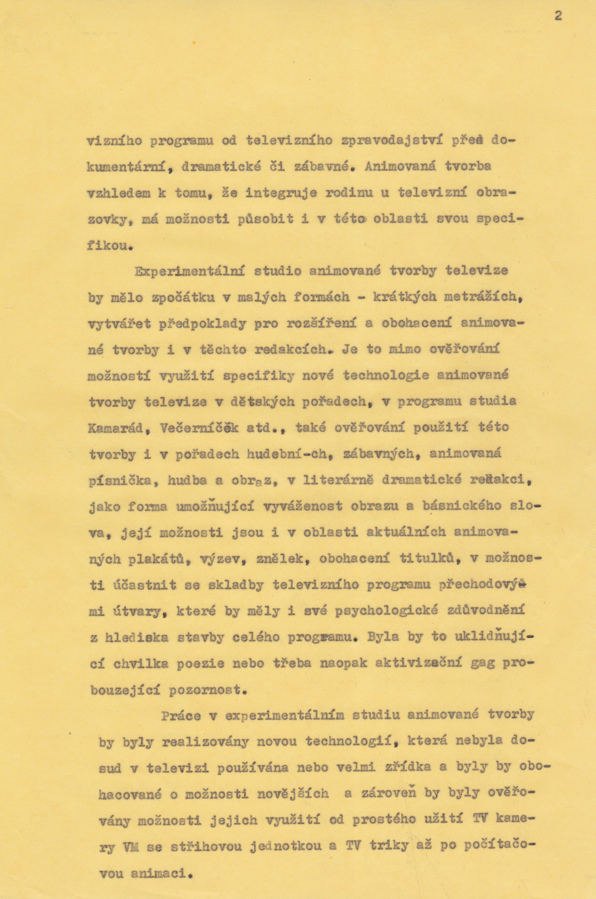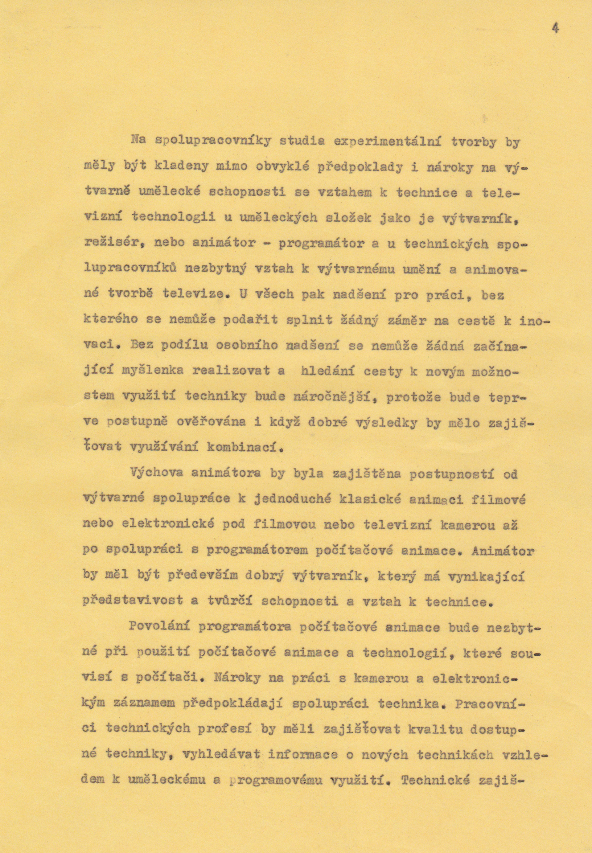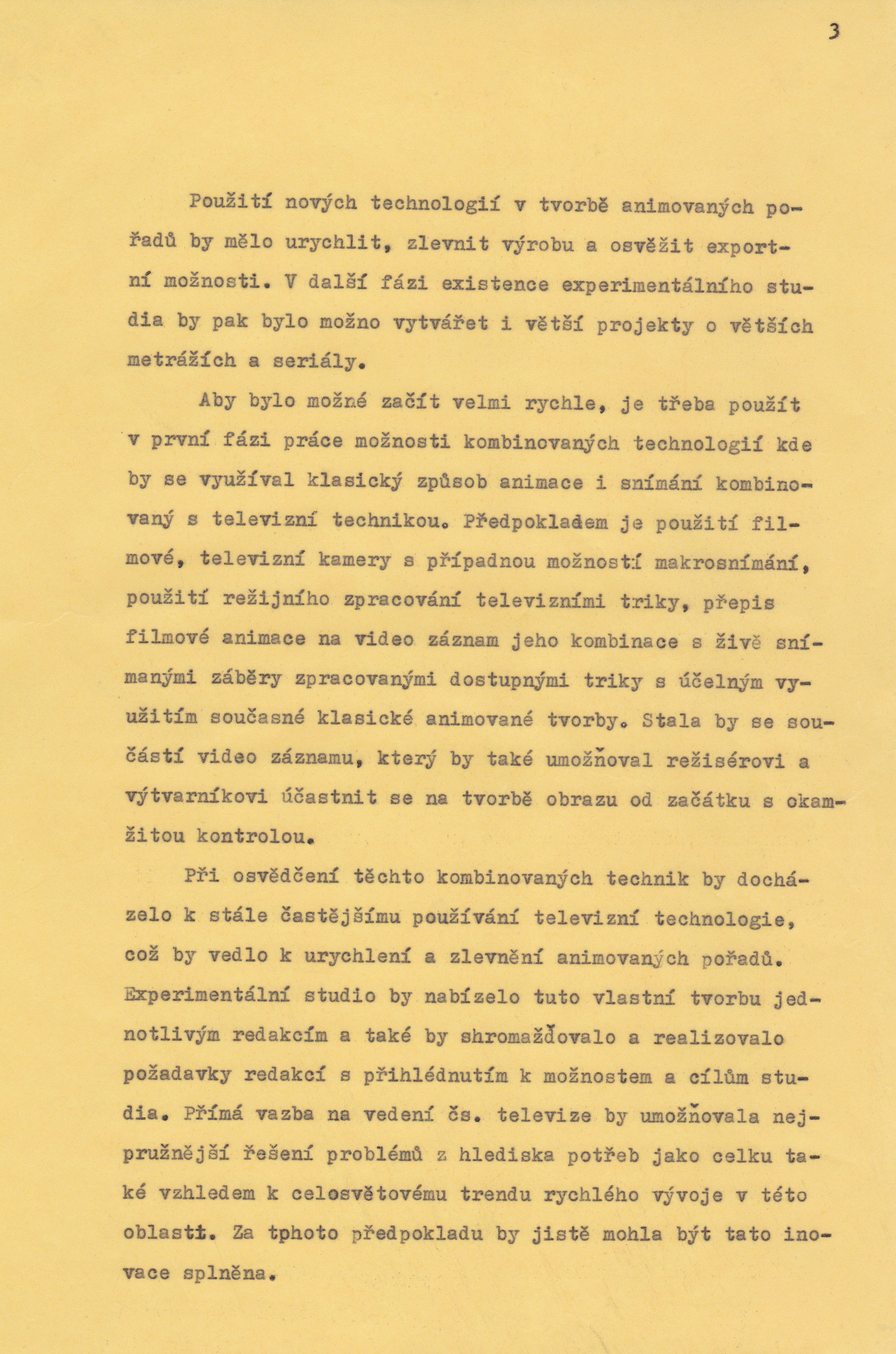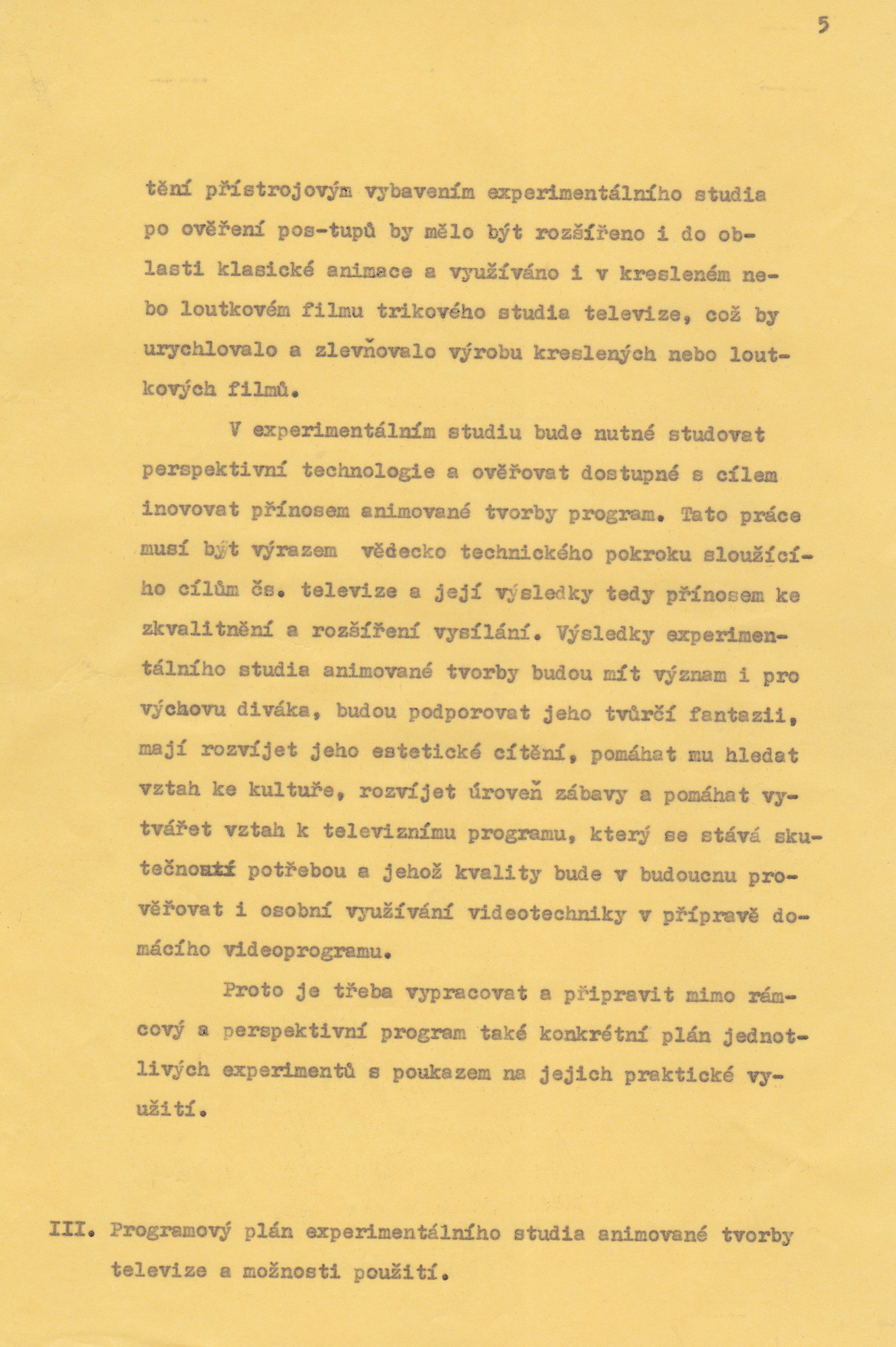 III. Programový plán experimentálního studia animované tvorby televize a možnosti použití.