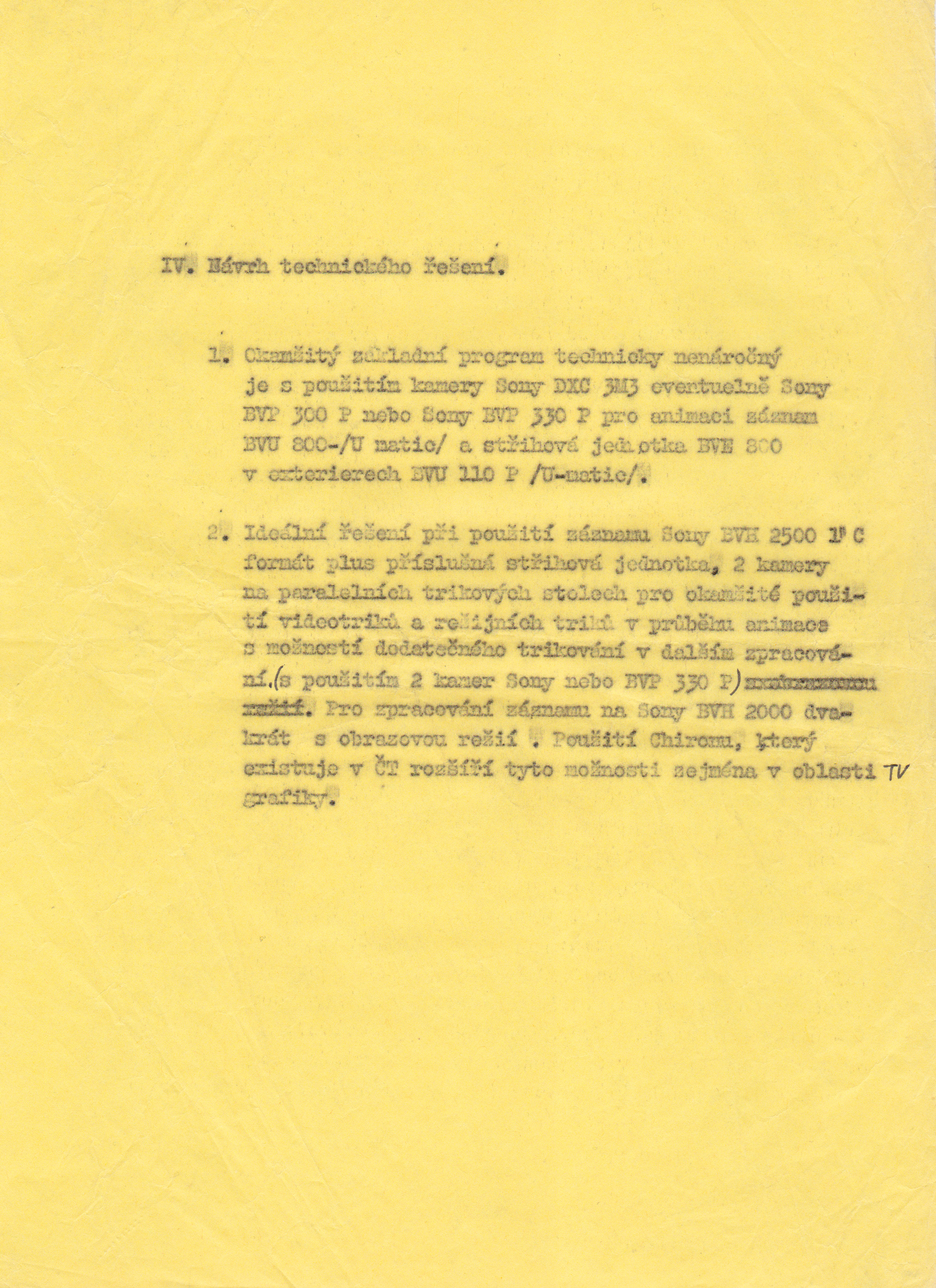 Popis: Strojopis, 1 strana. Dokument je přílohou tříbodového návrhu na zřízení experimentálního studia televizní animované tvorby (I. Animovaná tvorba jako výtvarně dramatická forma a výtvarně skladebné prostředky jako způsob animace, II. Animovaná tvorba televize a experimentální studio obrazového výzkumu, III. Programový plán experimentálního studia animované tvorby televize a možnosti použití). Radek Pilař uvádí konkrétní kamery, střihové jednotky a další vybavení pro „základní“ technicky nenáročný program, ale také „ideální řešení“ pro natáčení a postprodukci elektronického obrazového záznamu.