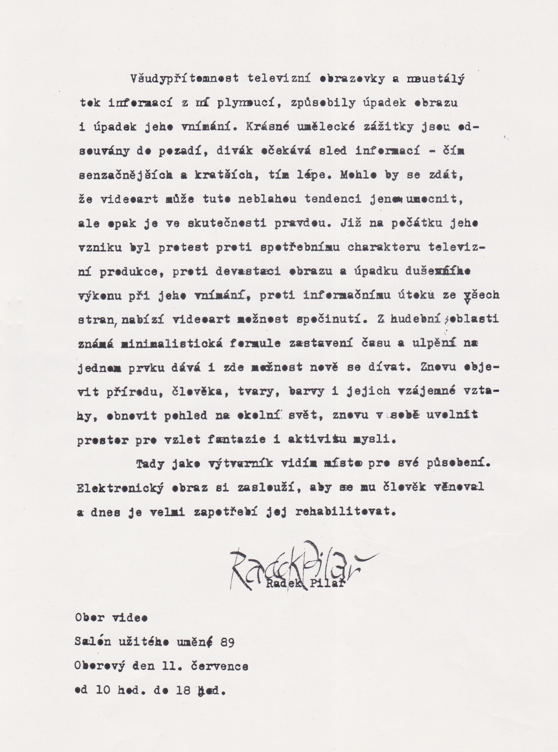 Popis: Prohlášení vydané u příležitosti jednodenní výstavy členů oboru video při SČVU, která se uskutečnila 11. července 1989 v rámci Salónu užitého umění ’89 pražských výtvarných umělců v Parku kultury a oddechu Julia Fučíka.