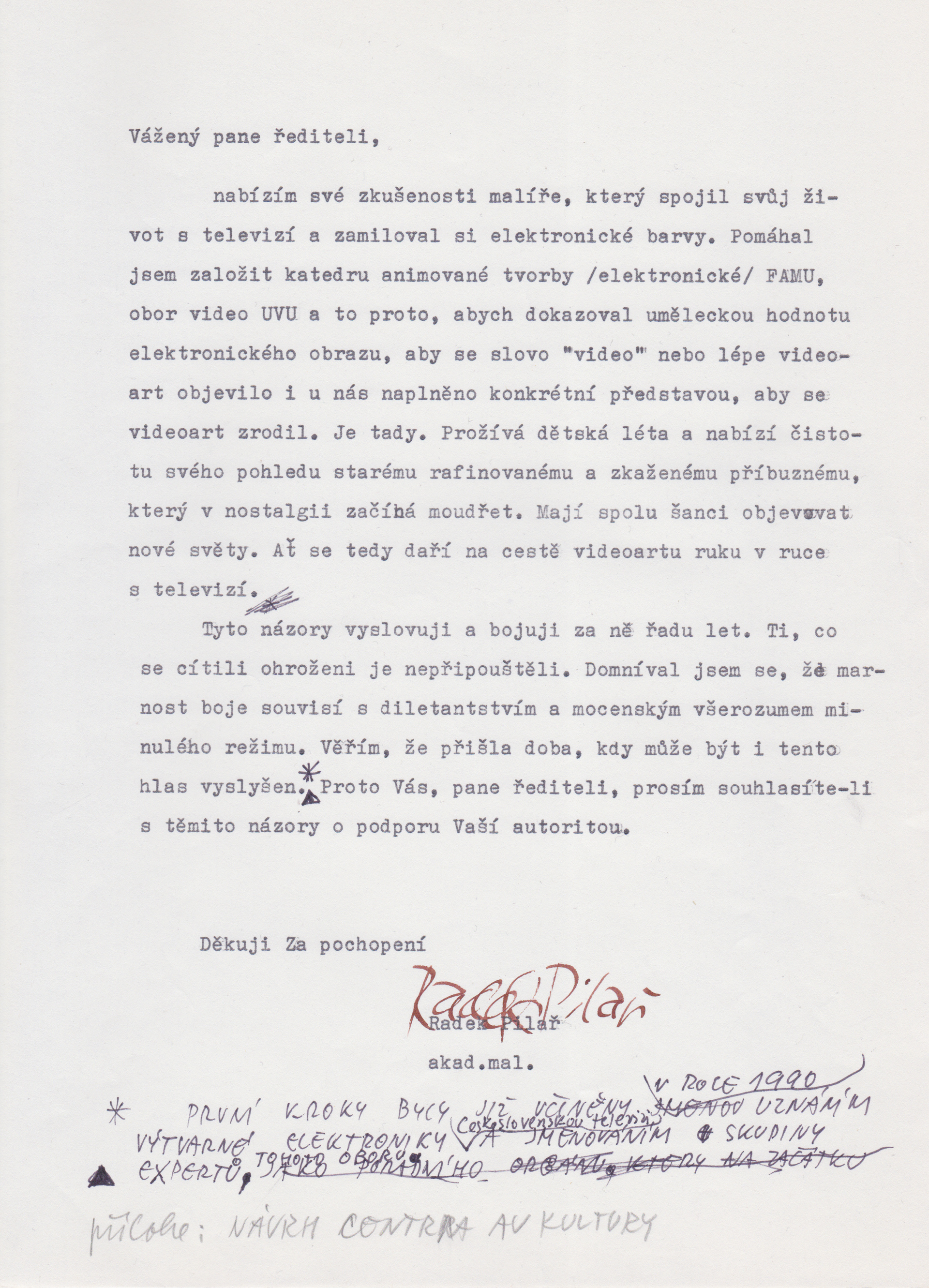 Popis: Koncept dopisu adresovaného ústřednímu řediteli ČST Jiřímu Kantůrkovi. Radek Pilař nabízí novému vedení „zkušenosti malíře, který spojil svůj život s televizí a zamiloval si elektronické barvy“.
