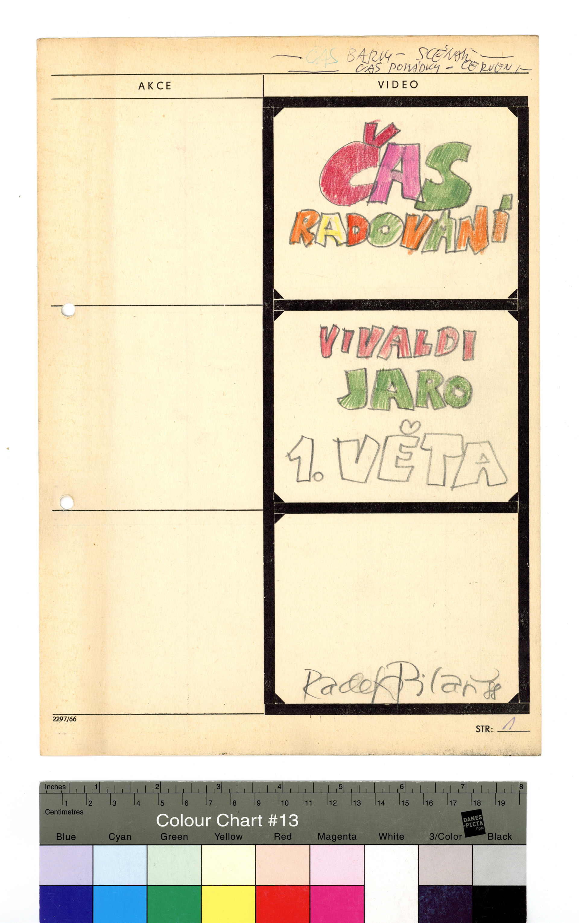 Popis: Technický scénář hudebního videa z cyklu Musica Picta. Tužka a pastelky na předtištěném formuláři formátu A4, 31 stran.
