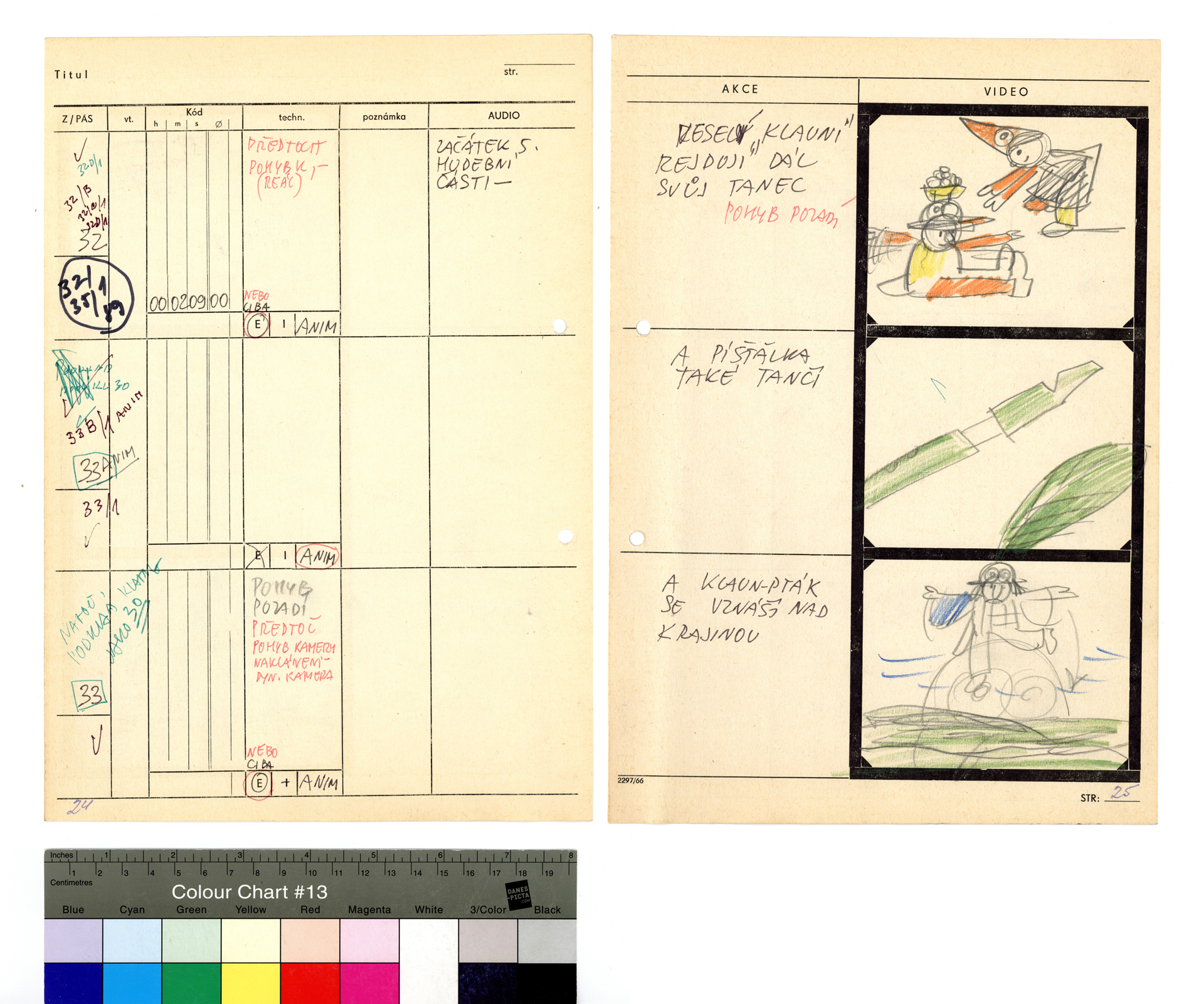 Popis: Technický scénář hudebního videa z cyklu Musica Picta. Tužka a pastelky na předtištěném formuláři formátu A4, 31 stran.