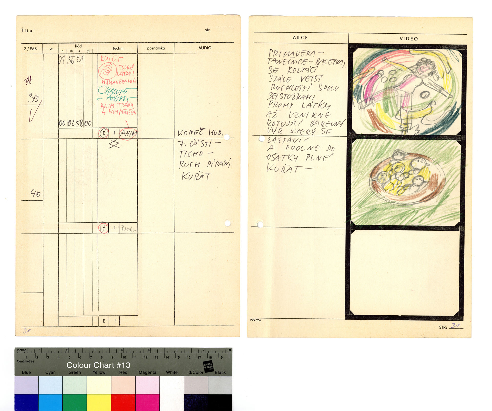 Popis: Technický scénář hudebního videa z cyklu Musica Picta. Tužka a pastelky na předtištěném formuláři formátu A4, 31 stran.