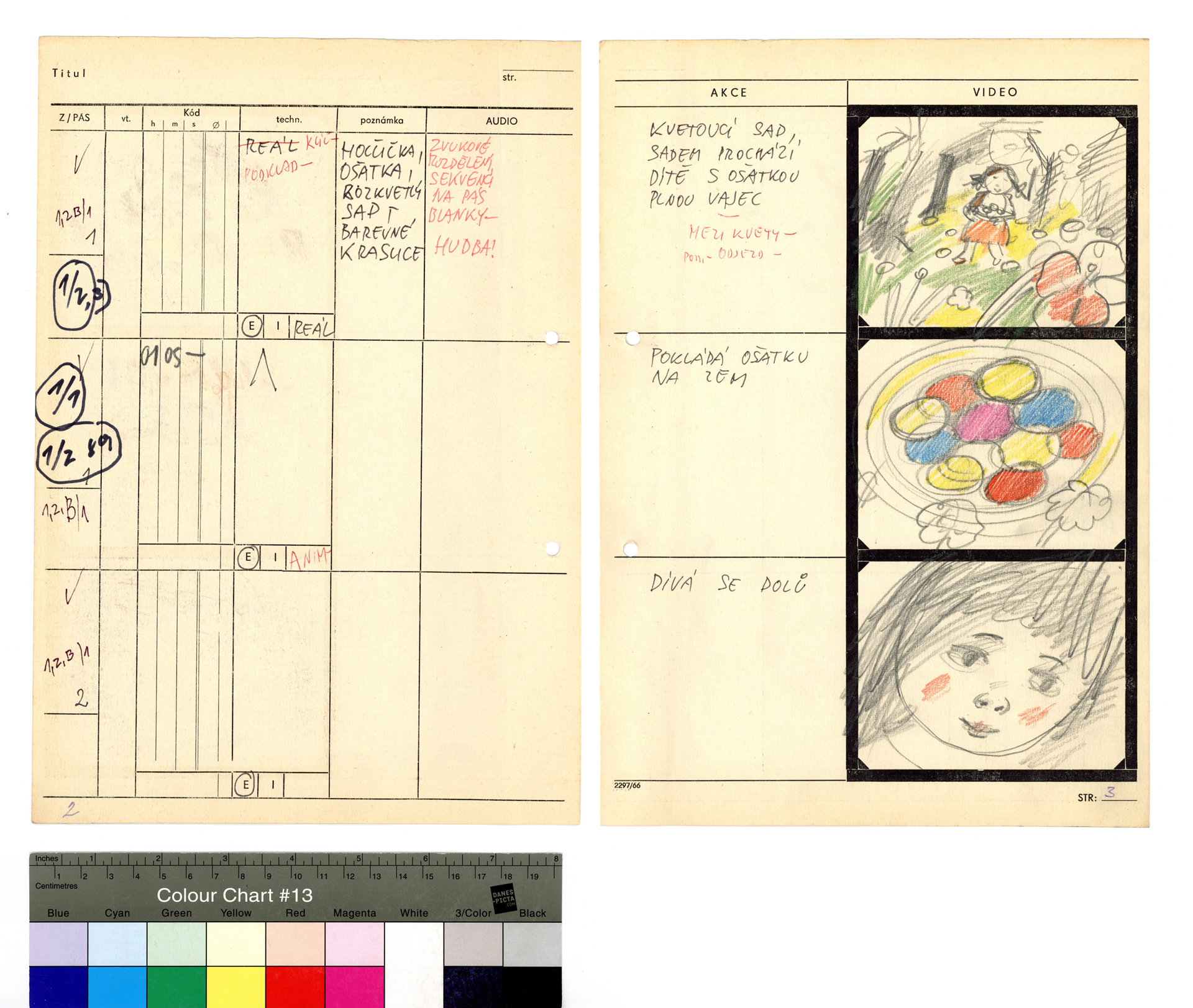 Popis: Technický scénář hudebního videa z cyklu Musica Picta. Tužka a pastelky na předtištěném formuláři formátu A4, 31 stran.