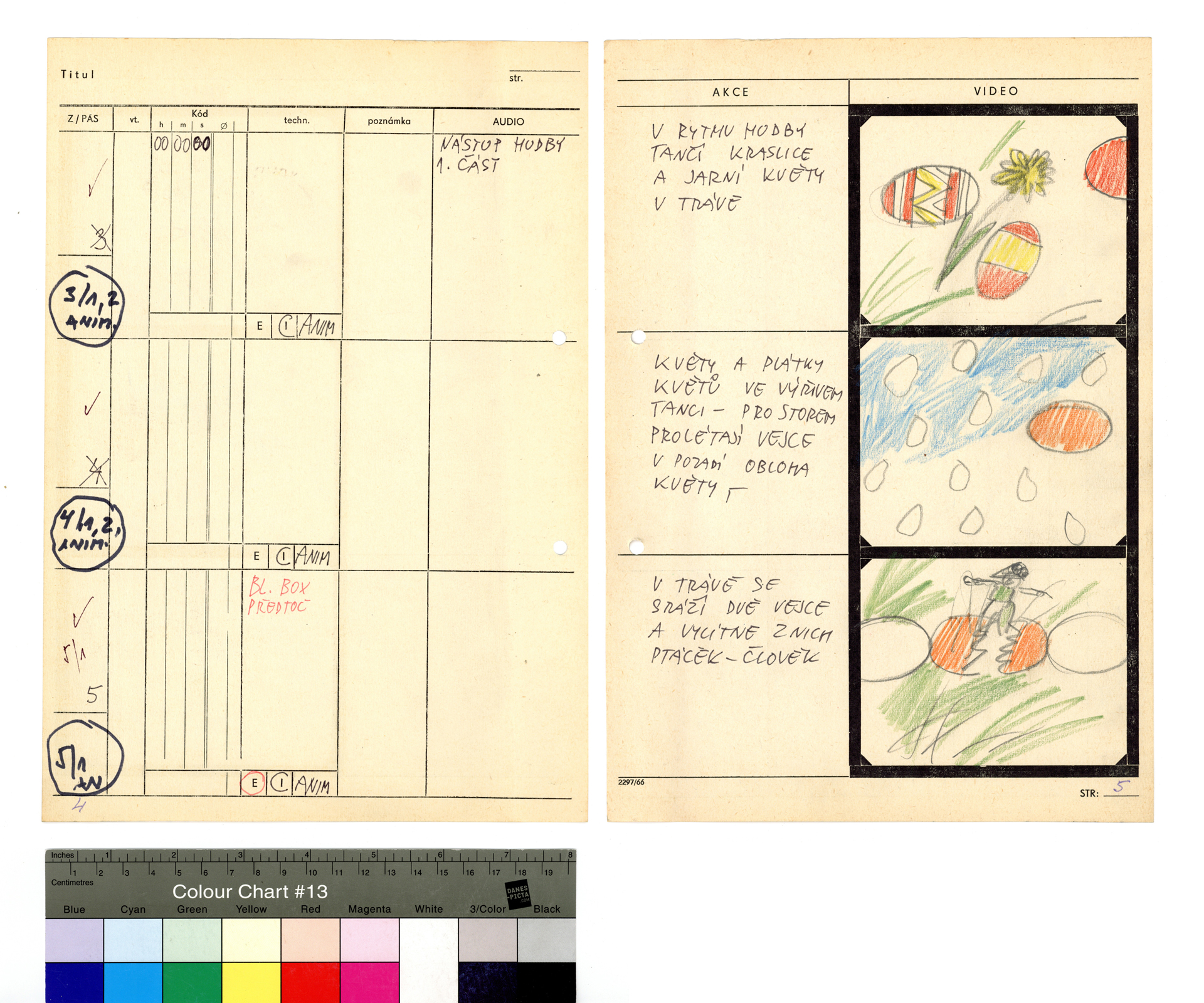 Popis: Technický scénář hudebního videa z cyklu Musica Picta. Tužka a pastelky na předtištěném formuláři formátu A4, 31 stran.