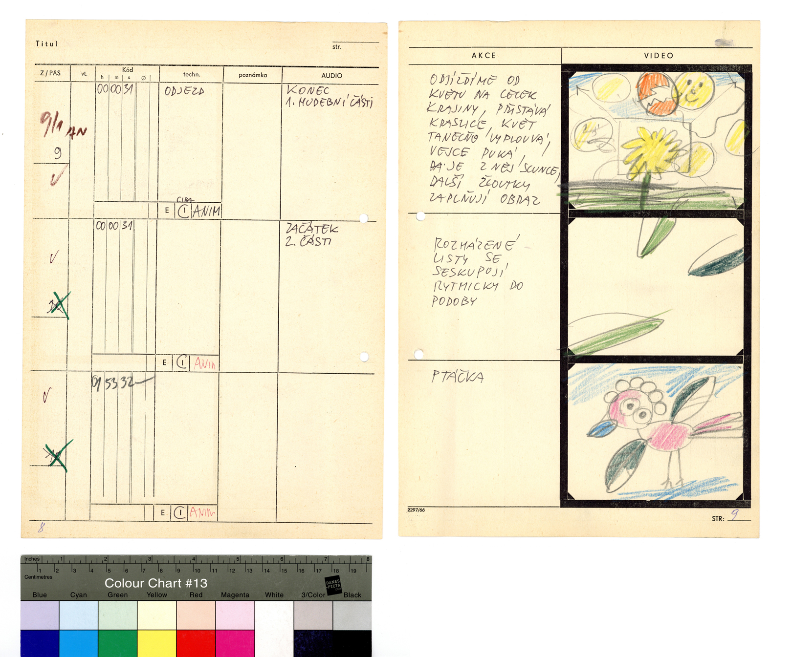 Popis: Technický scénář hudebního videa z cyklu Musica Picta. Tužka a pastelky na předtištěném formuláři formátu A4, 31 stran.