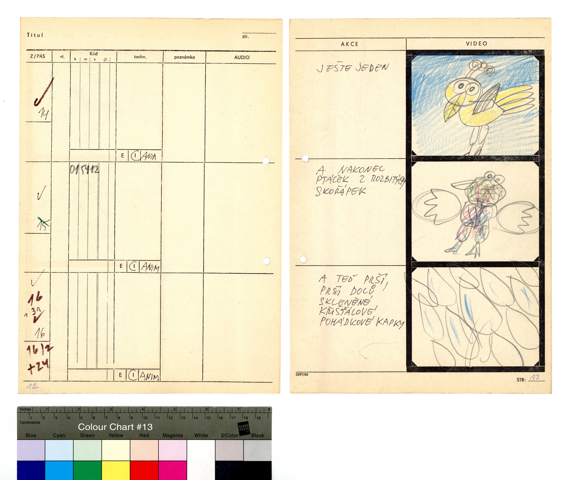 Popis: Technický scénář hudebního videa z cyklu Musica Picta. Tužka a pastelky na předtištěném formuláři formátu A4, 31 stran.