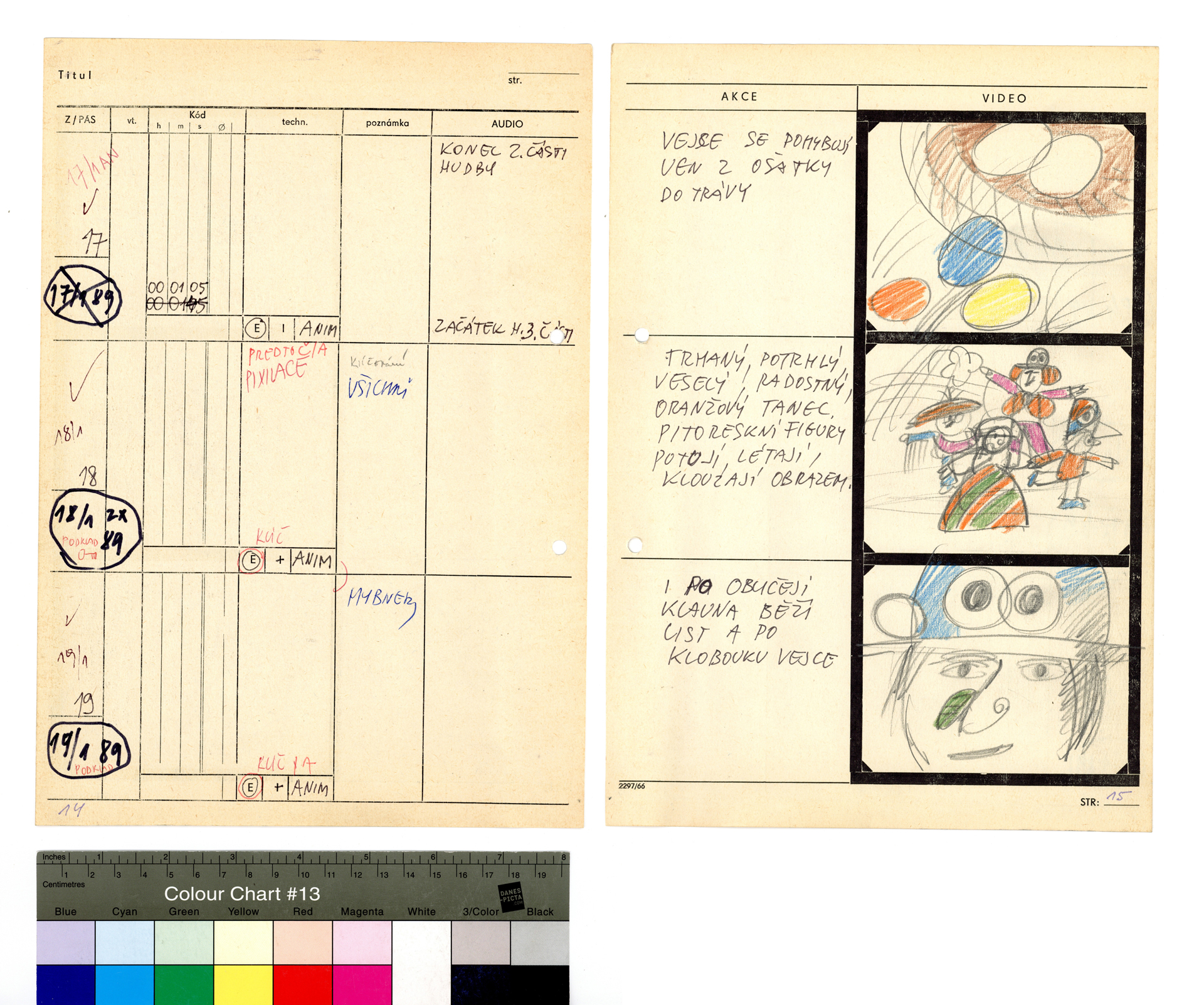 Popis: Technický scénář hudebního videa z cyklu Musica Picta. Tužka a pastelky na předtištěném formuláři formátu A4, 31 stran.