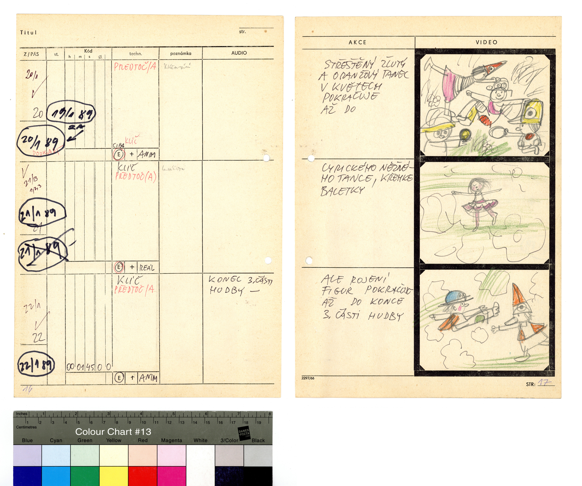Popis: Technický scénář hudebního videa z cyklu Musica Picta. Tužka a pastelky na předtištěném formuláři formátu A4, 31 stran.
