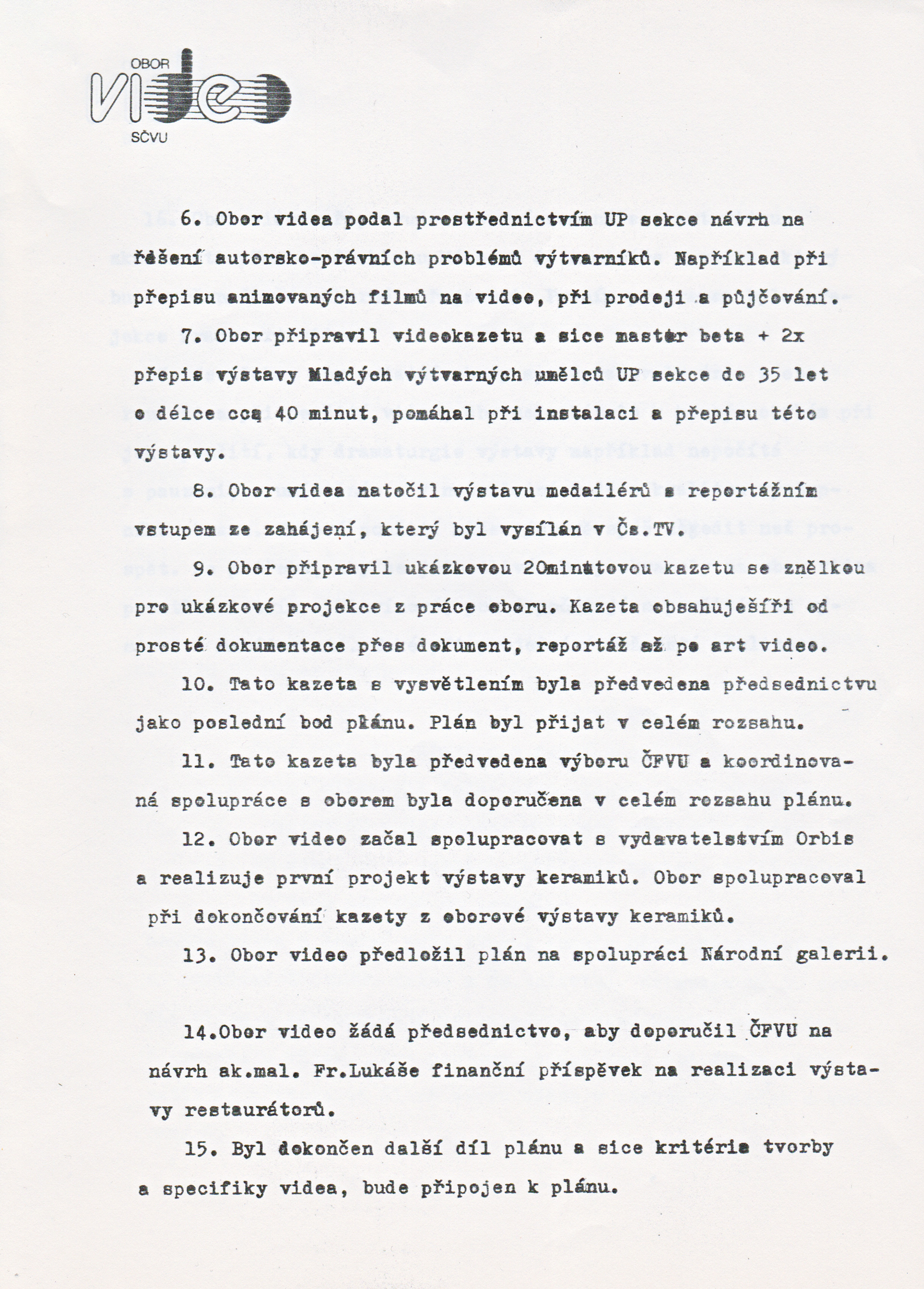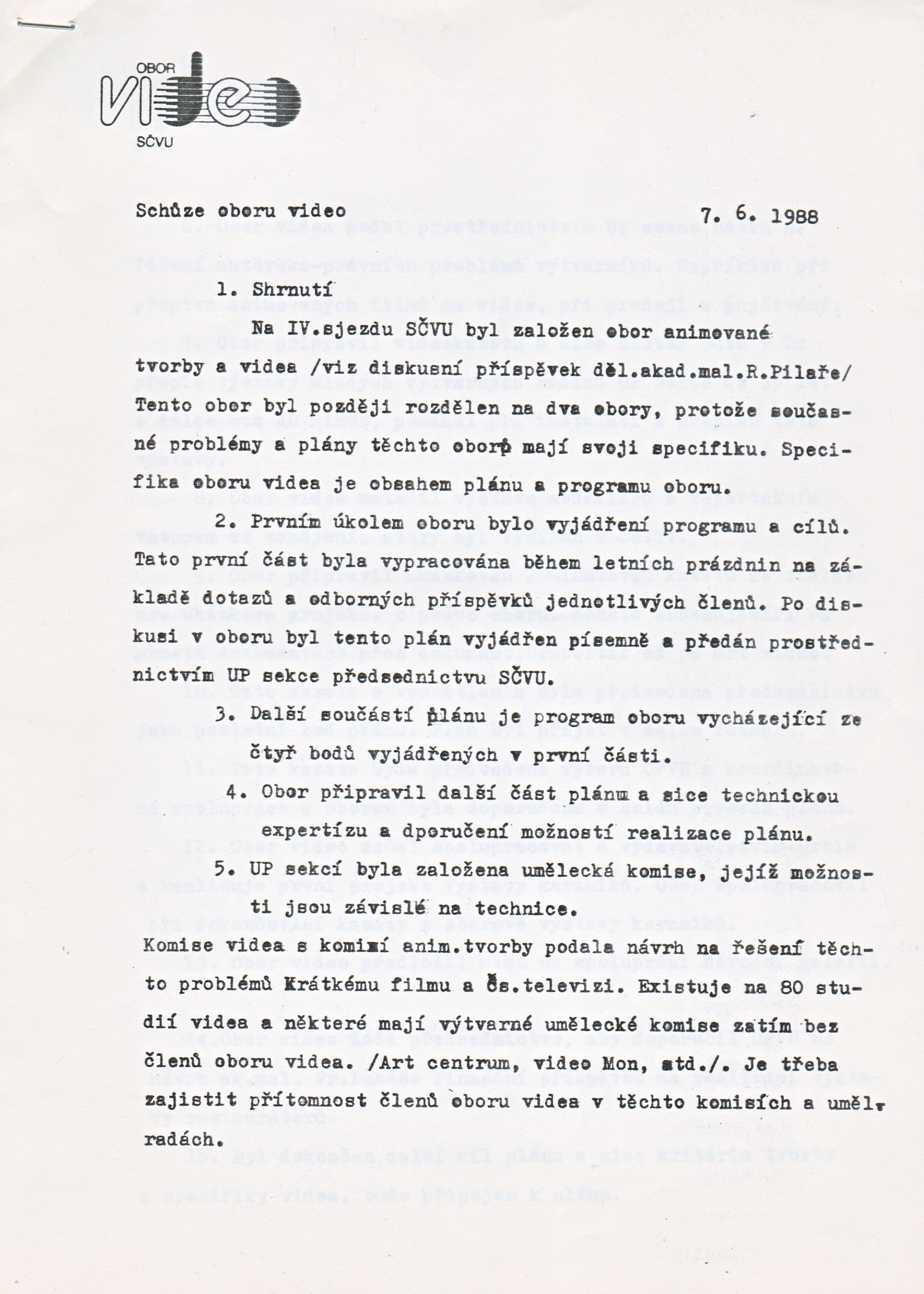 Popis: Zápis ze schůze oboru animované tvorby a videa ze 7. června 1988.