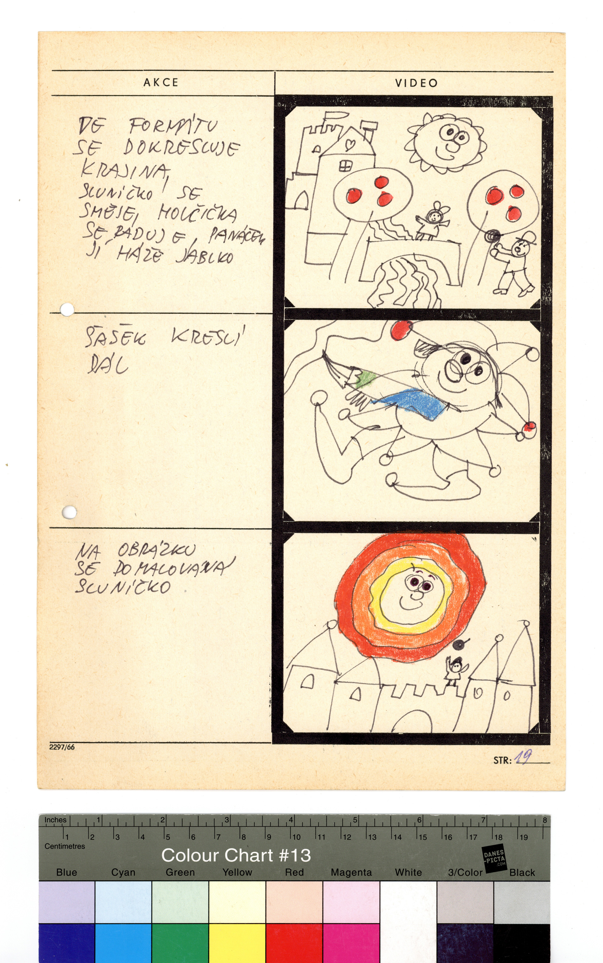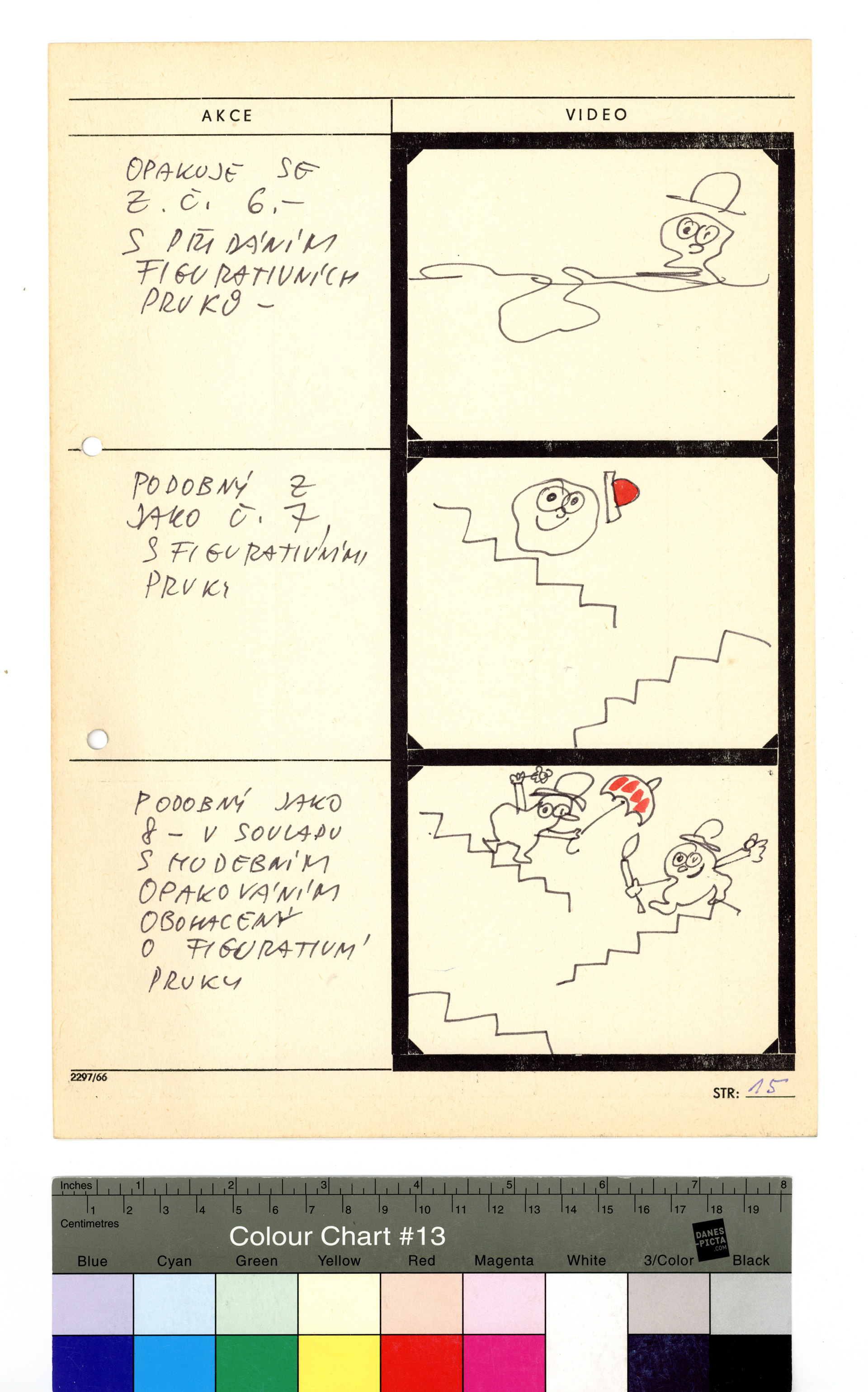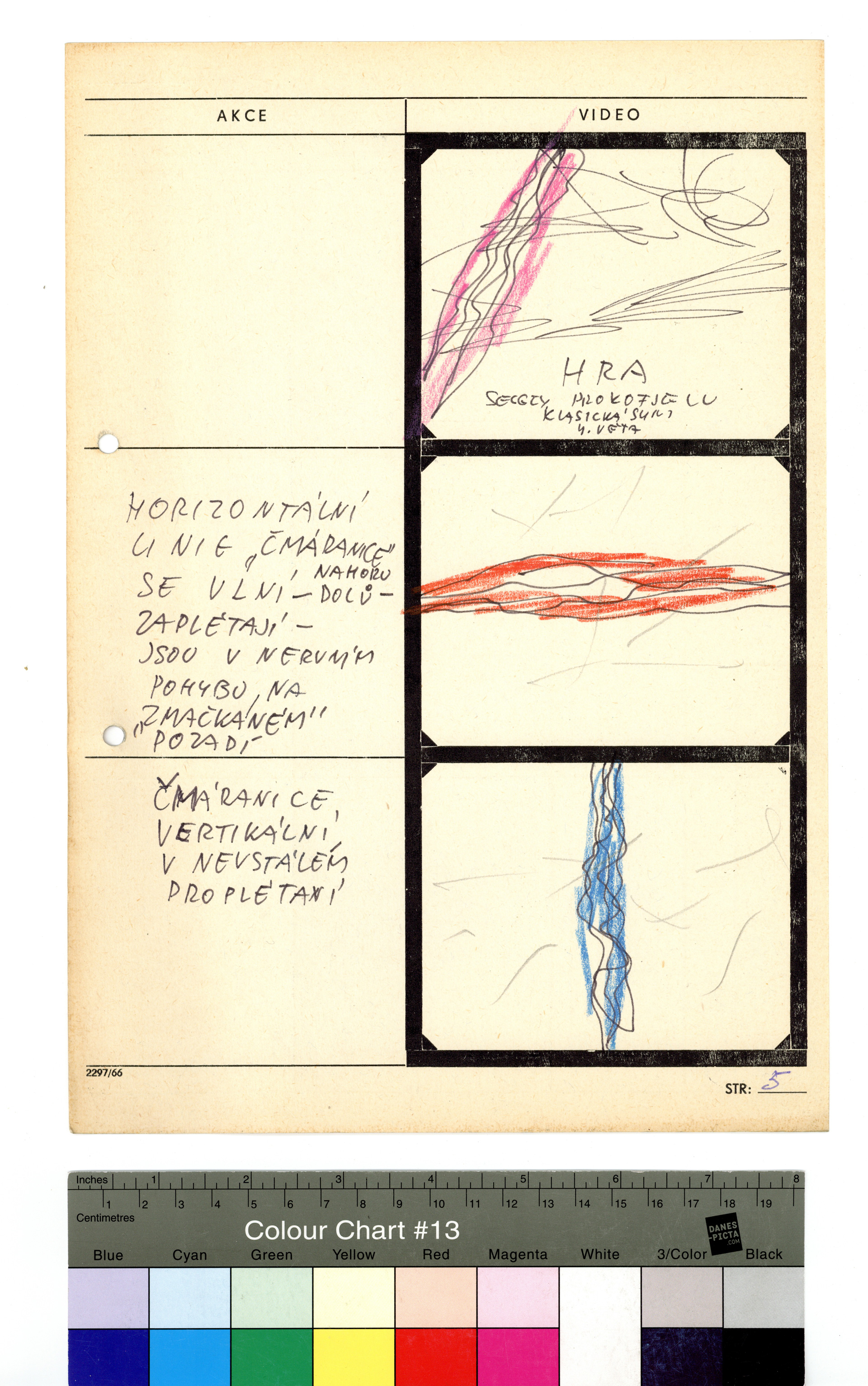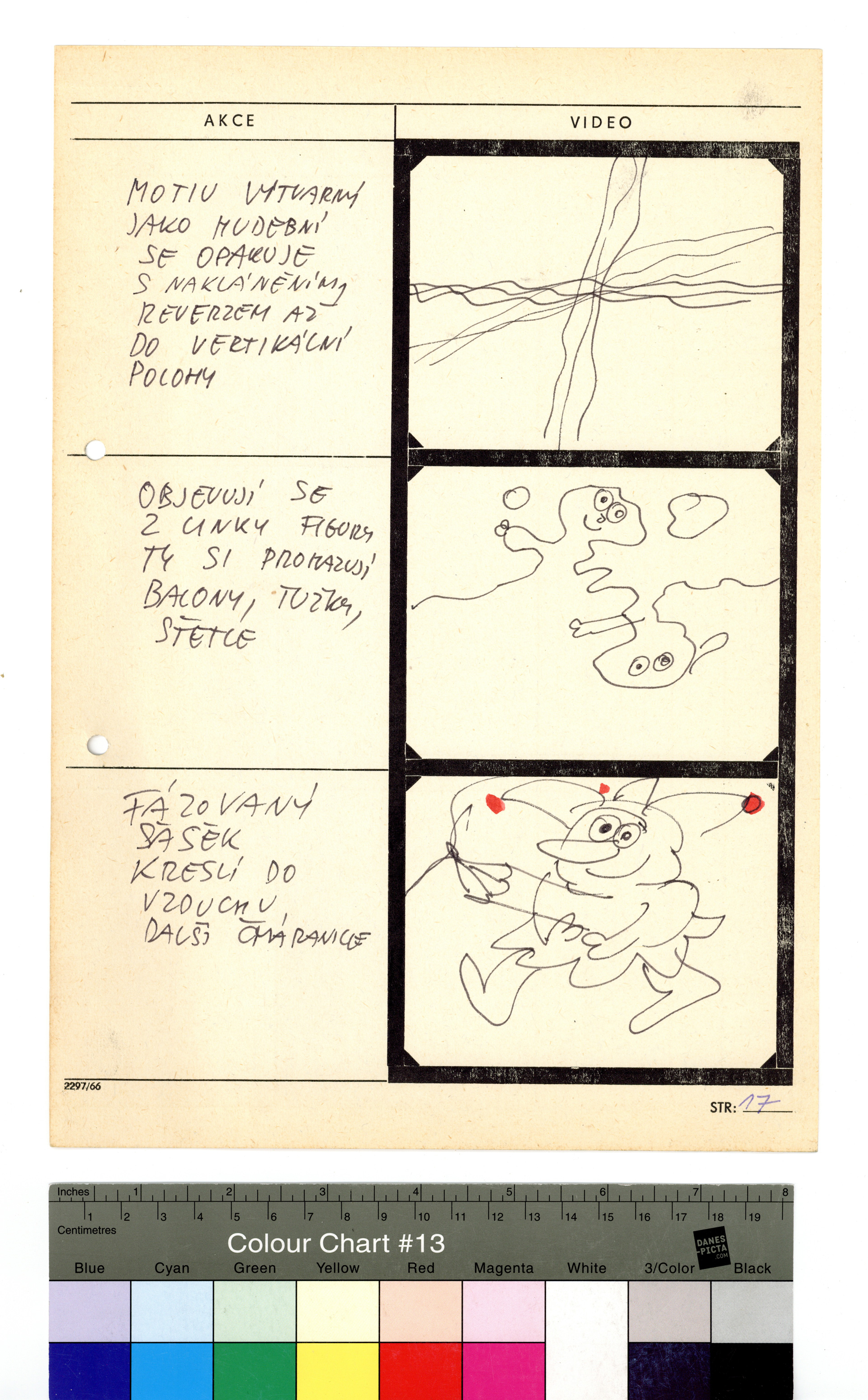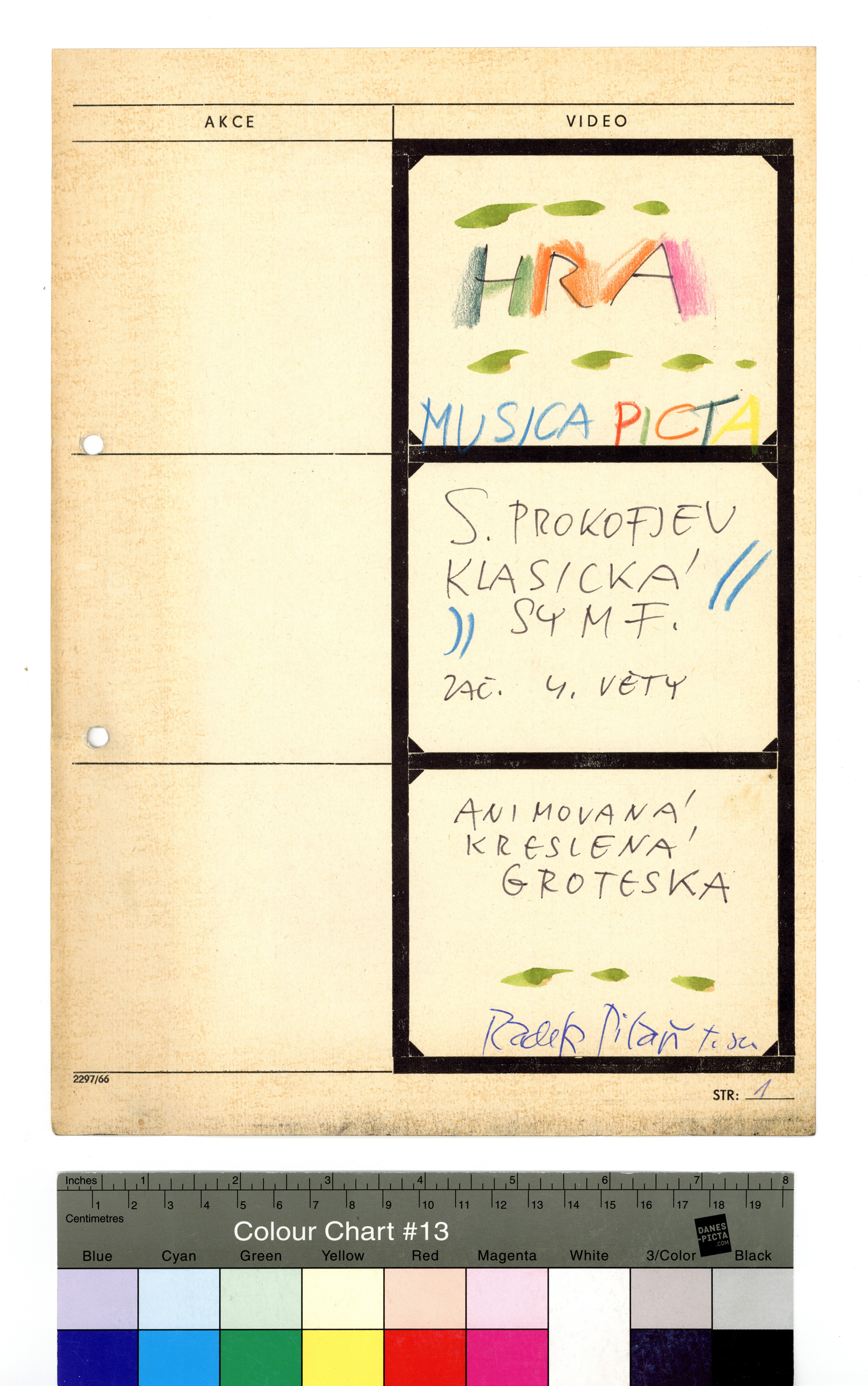 Popis: Technický scénář „animované kreslené grotesky“, nerealizovaného hudebního videa z cyklu Musica Picta. Tužka a pastelky na předtištěném formuláři formátu A4, 21 stran.