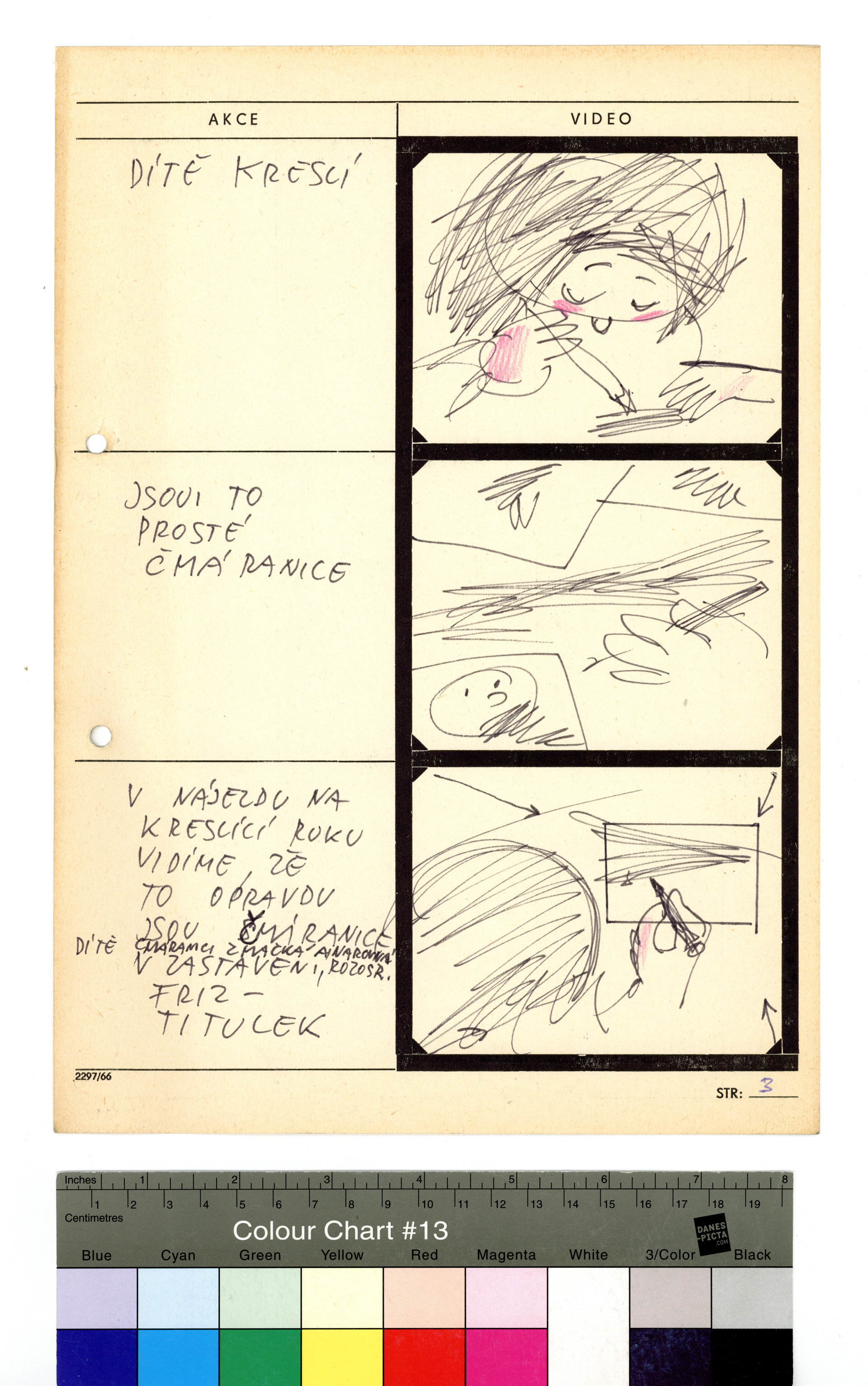 Popis: Technický scénář „animované kreslené grotesky“, nerealizovaného hudebního videa z cyklu Musica Picta. Tužka a pastelky na předtištěném formuláři formátu A4, 21 stran.