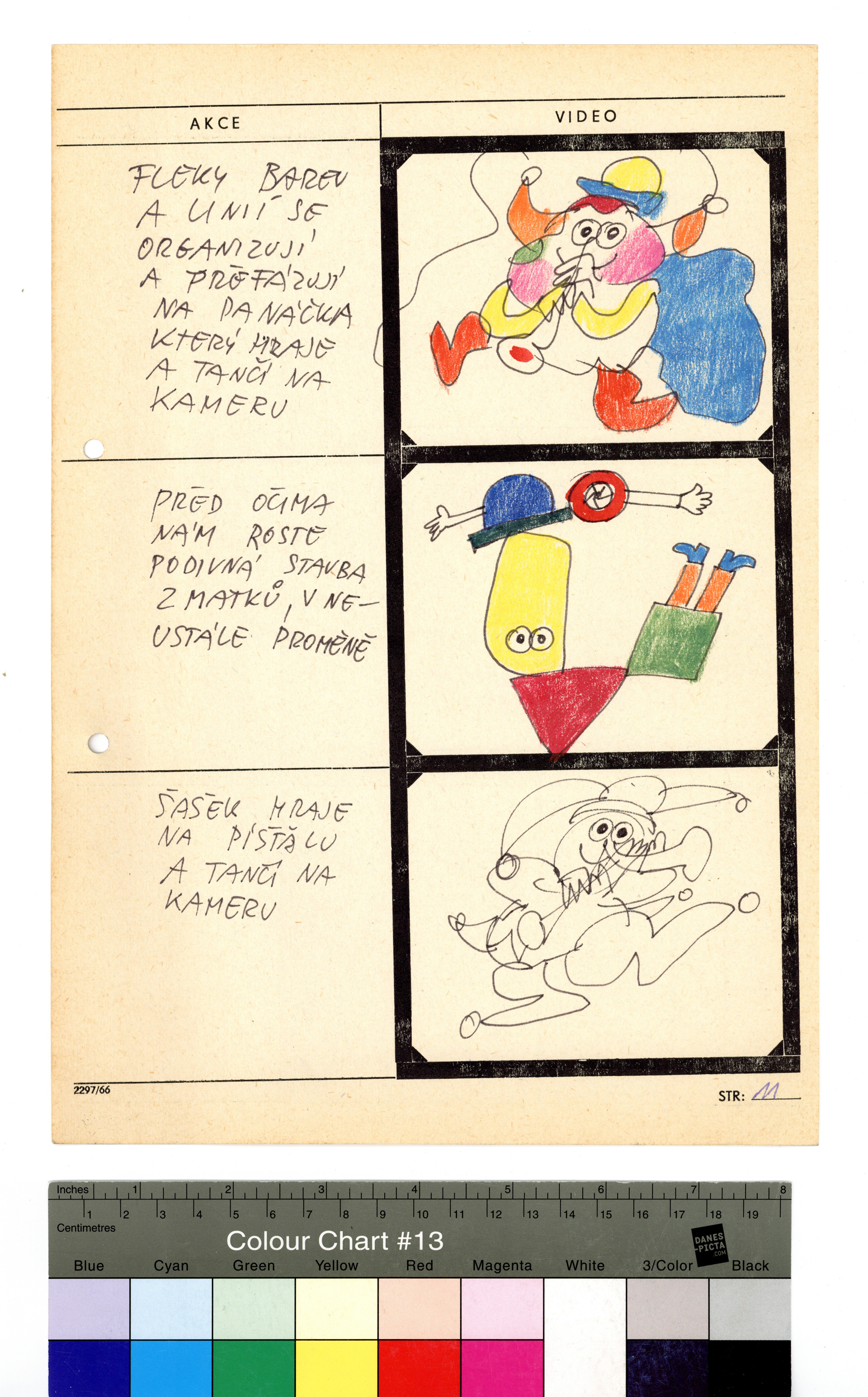 Popis: Technický scénář „animované kreslené grotesky“, nerealizovaného hudebního videa z cyklu Musica Picta. Tužka a pastelky na předtištěném formuláři formátu A4, 21 stran.