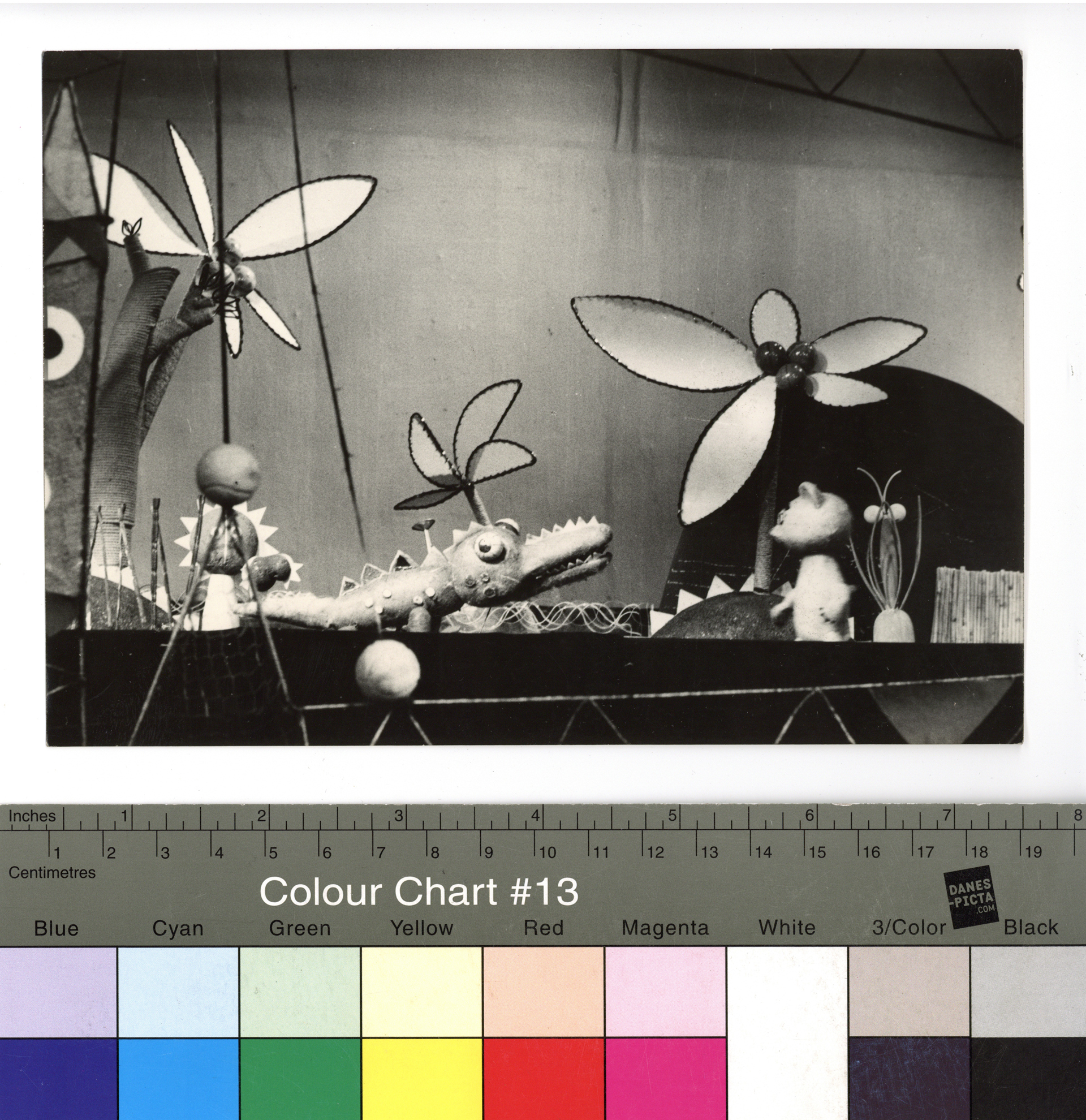 Popis: Snímek z televizní inscenace pohádky Hanny Januszewské o tygrovi, který se vypravil do světa hledat odvahu. Loutky a dekorace Radek Pilař. Režie Alexandr Zapletal. Československá televize, 1964. Foto Vlasta Gronská.