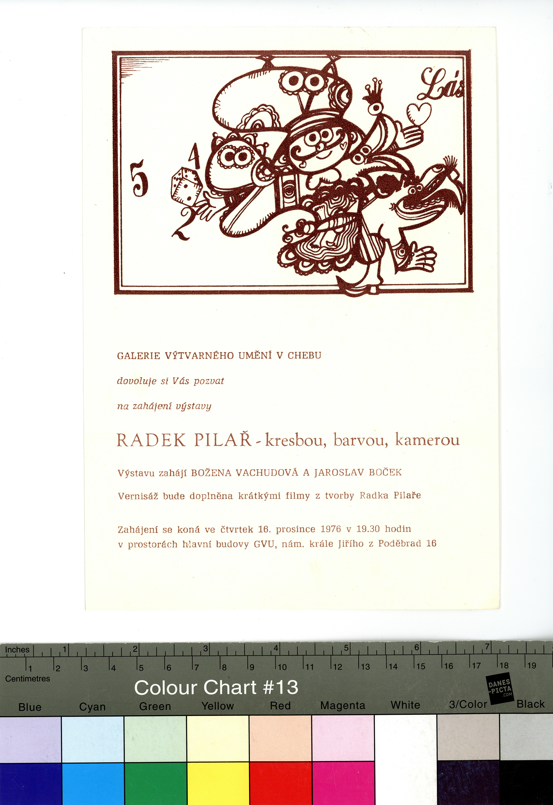 Popis: Pozvánka na výstavu Kresbou, barvou, kamerou v Galerii výtvarného umění v Chebu.