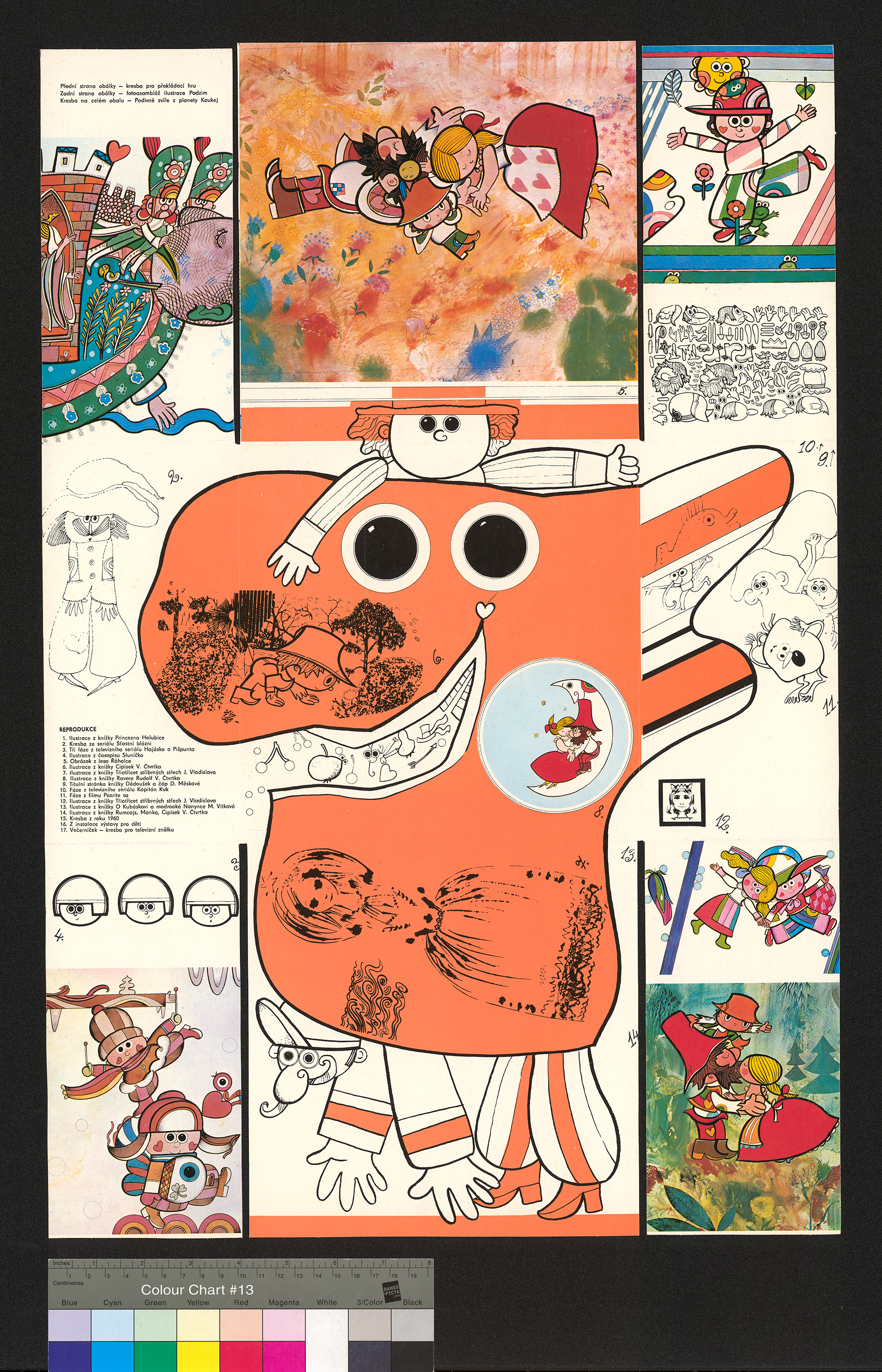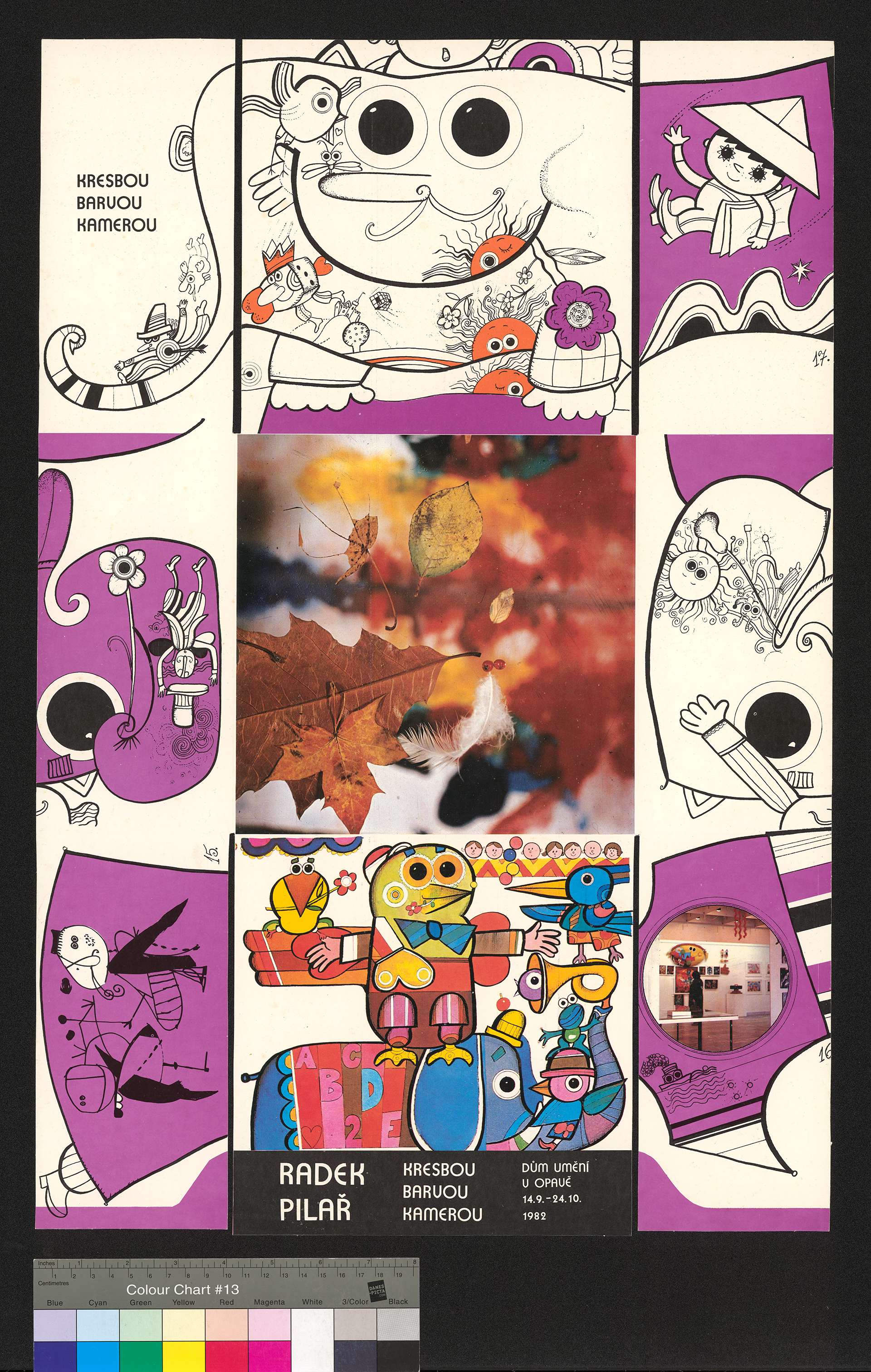 Popis: Rozložená obálka katalogu k výstavě Radek Pilař – kresbou, barvou, kamerou. Ofset, 417 × 627 mm. Dům umění v Opavě, 1982.
